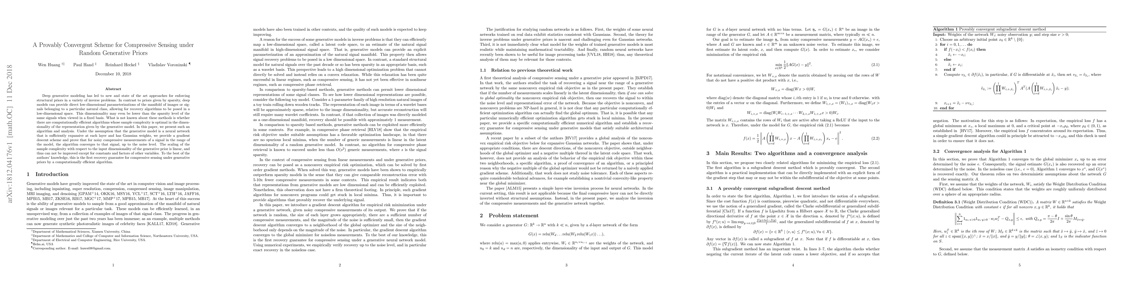 This paper introduces a gradient descent scheme for compressive sensing under random generative priors, proving its convergence for noisy measurements. The algorithm leverages deep generative models, showing optimal sample complexity scaling linearly with input dimensionality.