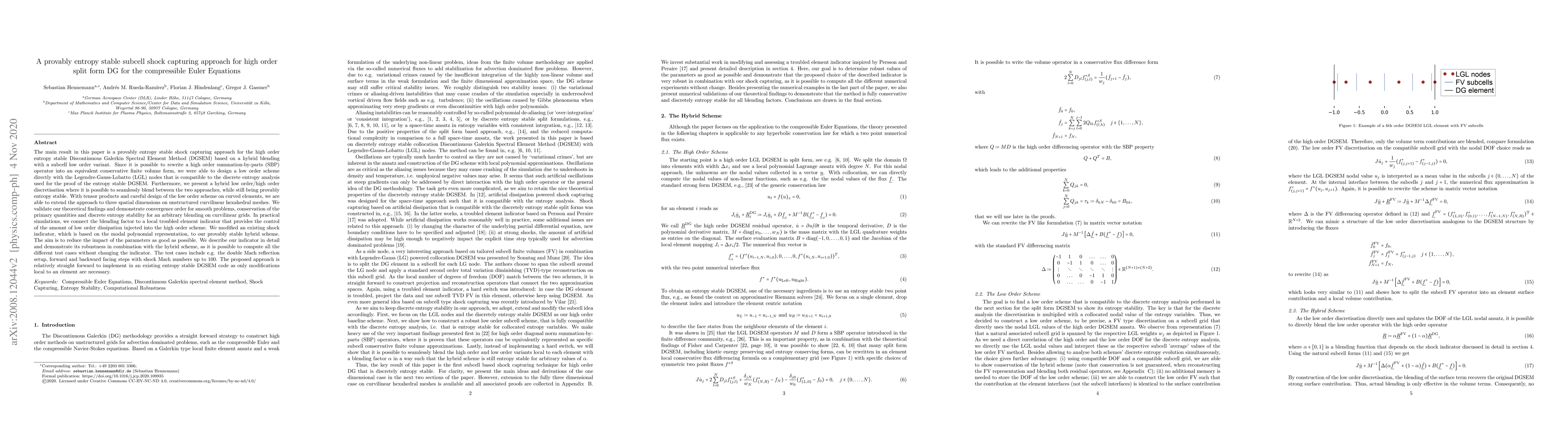The main result in this paper is a provably entropy stable shock capturing approach for the high order entropy stable DGSEM based on a hybrid blending with a subcell low order variant. Since it is possible to rewrite a high order SBP operator into an equivalent conservative finite volume form, we were able to design a low order scheme directly with the LGL nodes that is compatible to the discrete entropy analysis used for the proof of the entropy stable DGSEM. Furthermore, we present a hybrid low order/high order discretisation where it is possible to seamlessly blend between the two approaches, while still being provably entropy stable. We are able to extend the approach to three spatial dimensions on unstructured curvilinear hexahedral meshes. We validate our theoretical findings and demonstrate convergence order for smooth problems, conservation of the primary quantities and discrete entropy stability for an arbitrary blending on curvilinear grids. In practical simulations, we connect the blending factor to a local troubled element indicator that provides the control of the amount of low order dissipation injected into the high order scheme. We modified an existing shock indicator, which is based on the modal polynomial representation, to our provably stable hybrid scheme. The aim is to reduce the impact of the parameters as good as possible. We describe our indicator in detail and demonstrate its robustness in combination with the hybrid scheme, as it is possible to compute all the different test cases without changing the indicator. The test cases include e.g. the double Mach reflection setup, forward and backward facing steps with shock Mach numbers up to 100. The proposed approach is relatively straight forward to implement in an existing entropy stable DGSEM code as only modifications local to an element are necessary.