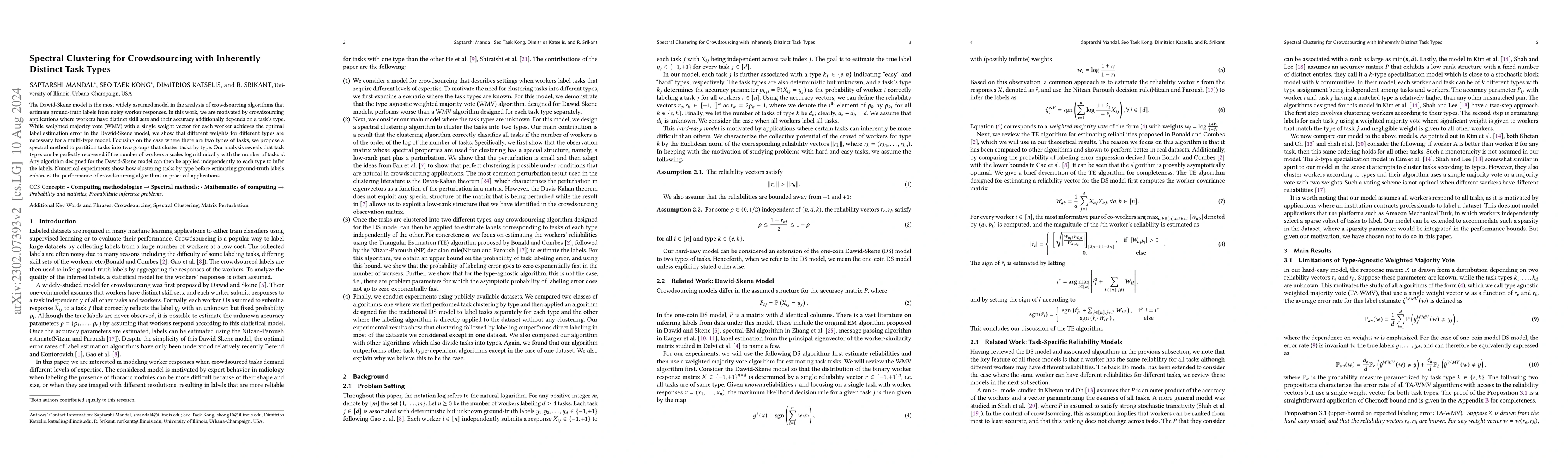 This paper proposes an improved algorithm for crowdsourcing that accounts for varying task difficulties, extending the traditional Dawid-Skene model. The new spectral method partitions tasks by difficulty and applies Dawid-Skene algorithms to each type, theoretically proving higher accuracy in inferring true labels compared to traditional methods.