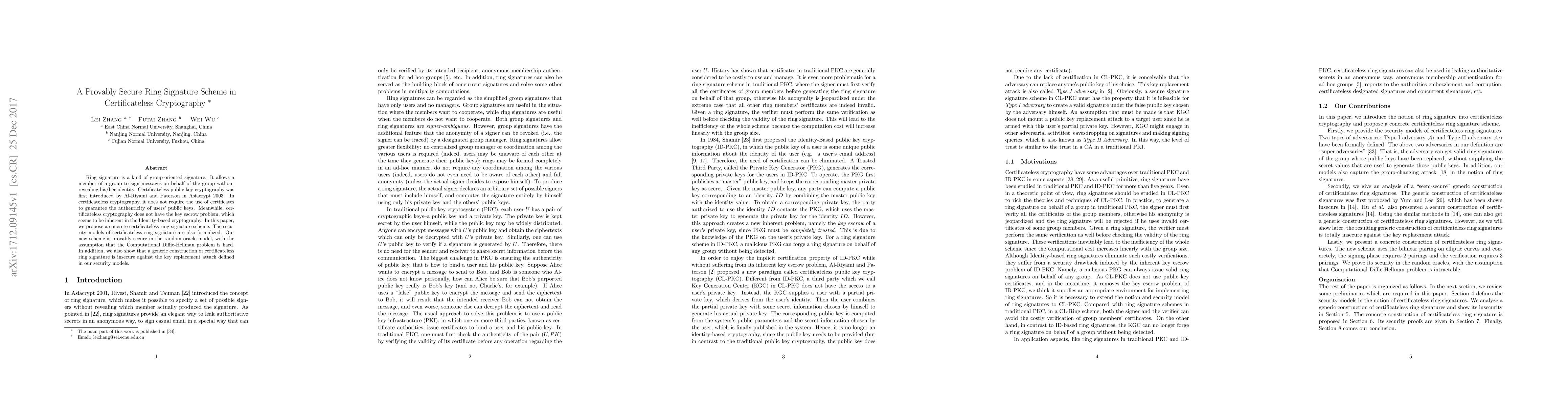 This paper proposes a provably secure certificateless ring signature scheme, eliminating the need for certificates and avoiding key escrow issues. The scheme is formally proven secure under the Computational Diffie-Hellman problem assumption and highlights the insecurity of generic constructions against key replacement attacks.