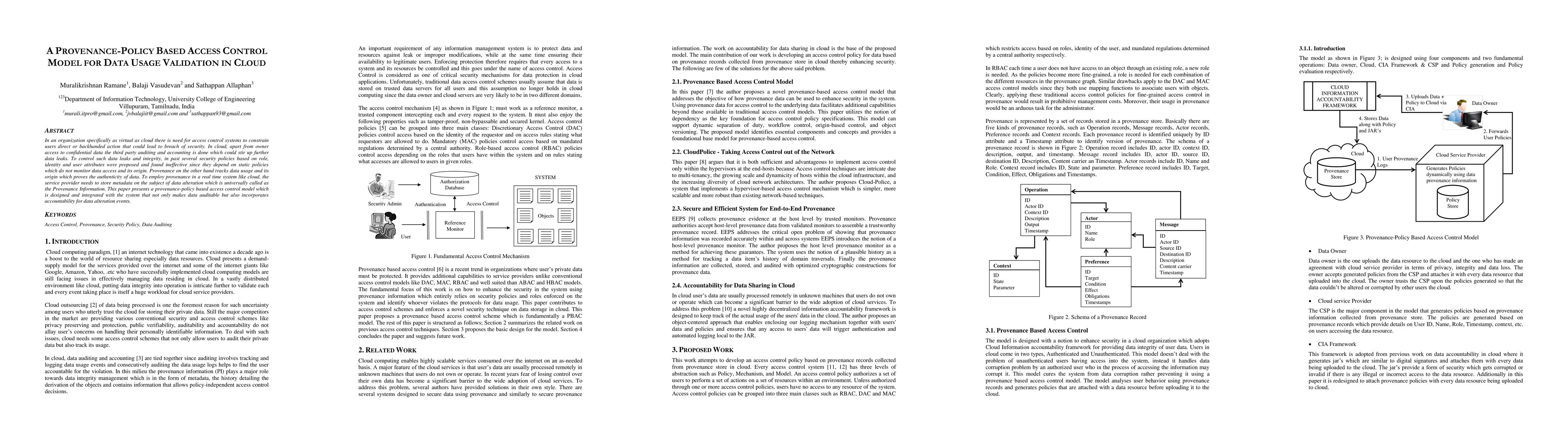 This paper proposes a provenance-policy based access control model for data usage validation in cloud environments, aiming to enhance security by tracking data origin and usage, thereby ensuring data integrity and accountability beyond static role-based policies. The model integrates provenance information to audit and monitor data alterations effectively.