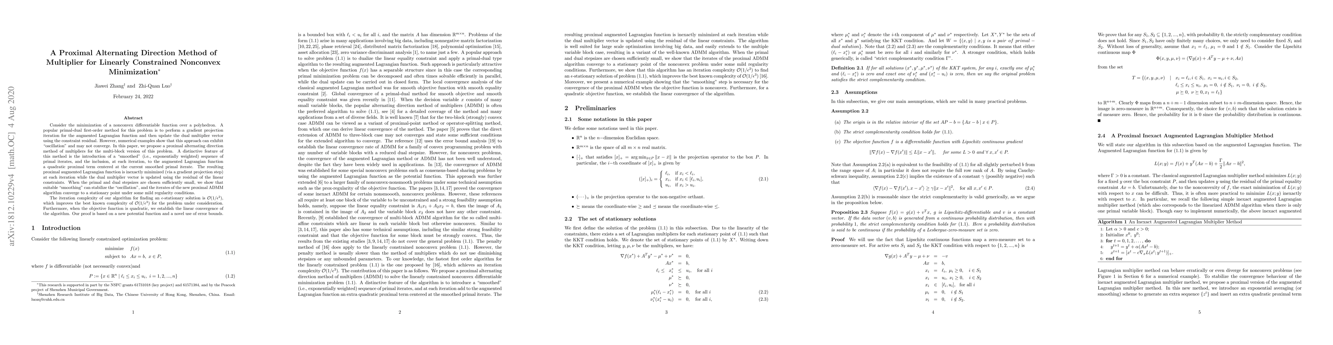 This paper proposes a proximal alternating direction method of multipliers (ADMM) to stabilize the minimization of nonconvex differentiable functions over a polyhedron. The method introduces a smoothed primal iterate and a proximal term to the augmented Lagrangian, leading to convergence to a stationary point and linear convergence when the objective is quadratic.