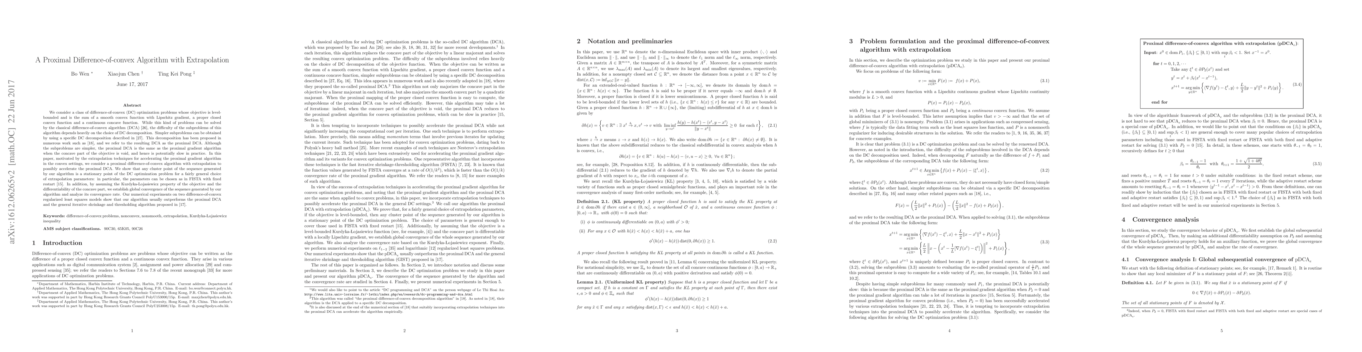 This paper proposes a proximal difference-of-convex algorithm with extrapolation to accelerate the proximal DCA, demonstrating convergence and superior performance over existing methods in numerical experiments. The algorithm leverages extrapolation techniques to achieve faster convergence and is shown to find stationary points under general conditions.