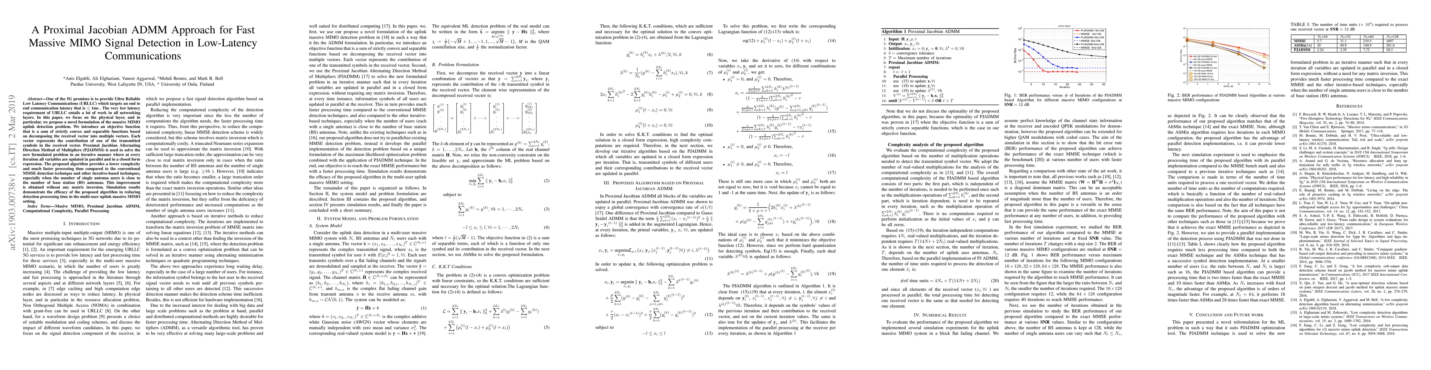 One of the 5G promises is to provide Ultra Reliable Low Latency Communications (URLLC) which targets an end to end communication latency that is less than 1ms . The very low latency requirement of URLLC entails a lot of work in all networking layers. In this paper, we focus on the physical layer, and in particular, we propose a novel formulation of the massive MIMO uplink detection problem. We introduce an objective function that is a sum of strictly convex and separable functions based on decomposing the received vector into multiple vectors. Each vector represents the contribution of one of the transmitted symbols in the received vector. Proximal Jacobian Alternating Direction Method of Multipliers (PJADMM) is used to solve the new formulated problem in an iterative manner where at every iteration all variables are updated in parallel and in a closed form expression. The proposed algorithm provides a lower complexity and much faster processing time compared to the conventional MMSE detection technique and other iterative-based techniques, especially when the number of single antenna users is close to the number of base station (BS) antennas. This improvement is obtained without any matrix inversion. Simulation results demonstrate the efficacy of the proposed algorithm in reducing detection processing time in the multi-user uplink massive MIMO setting.