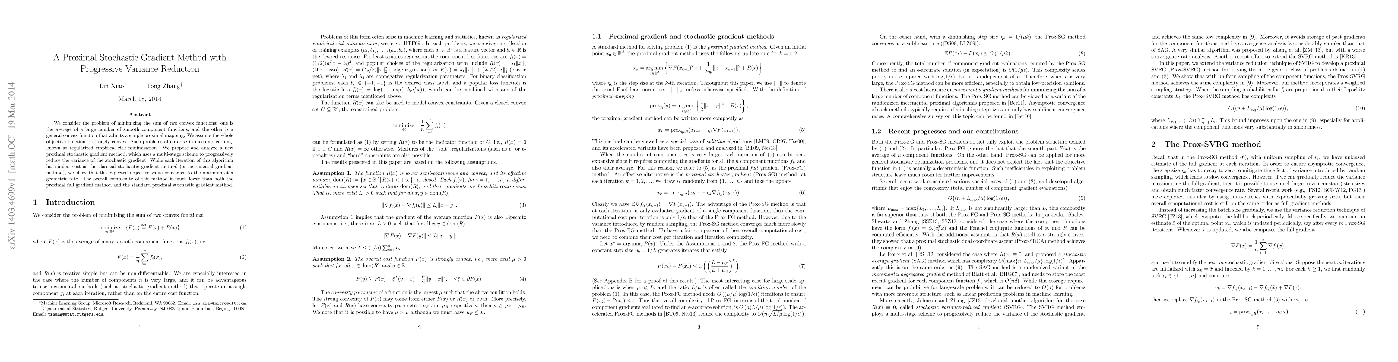 This paper proposes a new proximal stochastic gradient method that progressively reduces variance in each iteration to achieve geometric convergence to the optimum for minimizing the sum of a large number of smooth functions and a general convex function. The method's complexity is lower than both the proximal full gradient and standard proximal stochastic gradient methods.