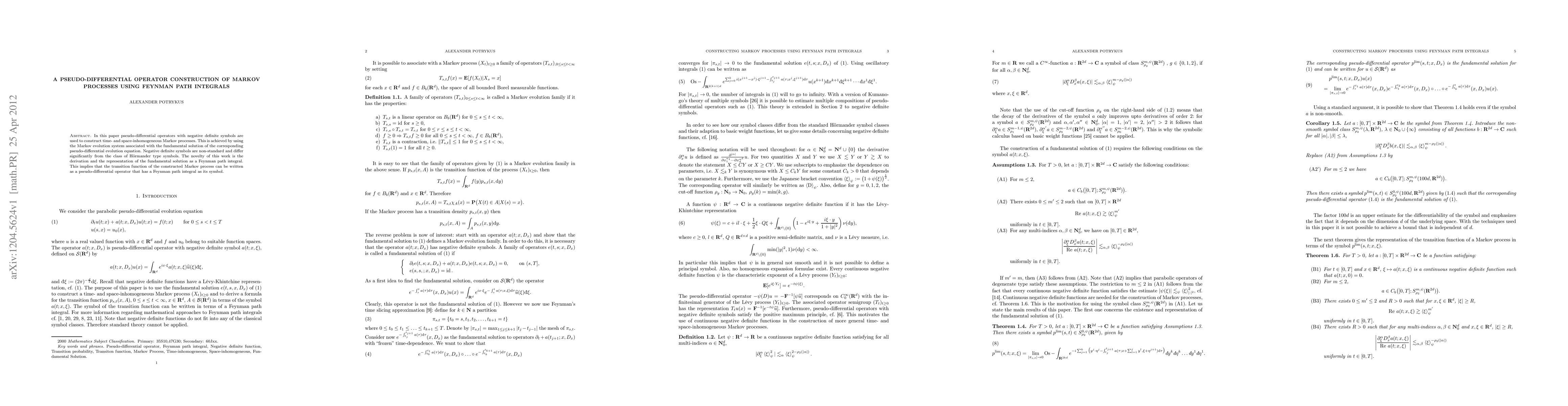This paper constructs time- and space-inhomogeneous Markov processes using pseudo-differential operators with negative definite symbols, represented via a Feynman path integral. The novelty lies in deriving and representing the fundamental solution as a Feynman path integral, leading to a transition function expressed as a pseudo-differential operator with a Feynman path integral symbol.