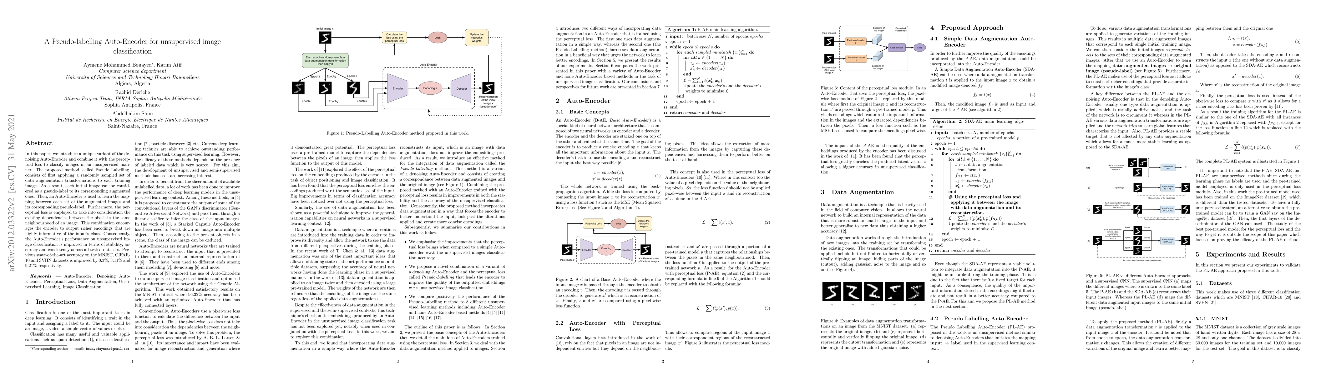 This paper proposes a Pseudo-labelling Auto-Encoder that uses data augmentation and perceptual loss for unsupervised image classification, achieving improved accuracy on MNIST, CIFAR-10, and SVHN datasets by 0.3%, 3.11%, and 9.21% respectively. The method enhances the Auto-Encoder's performance through richer, class-informative encodings.