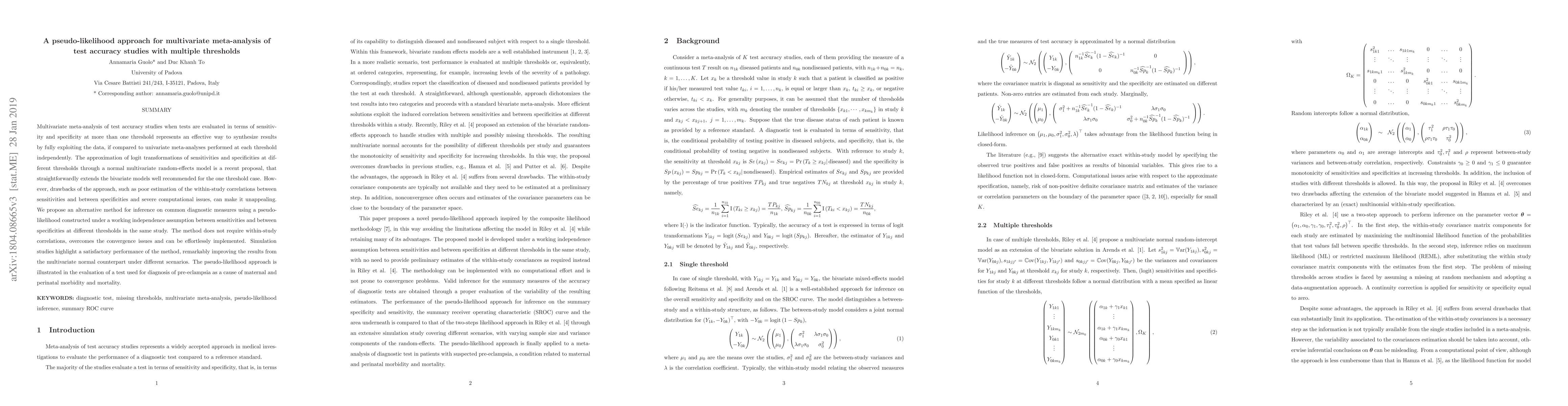 This paper proposes a pseudo-likelihood approach for multivariate meta-analysis of test accuracy studies with multiple thresholds, addressing computational and estimation drawbacks of existing normal multivariate models. The method, which assumes independence between sensitivities and specificities, shows improved performance in simulations and is demonstrated in a study on pre-eclampsia diagnosis.