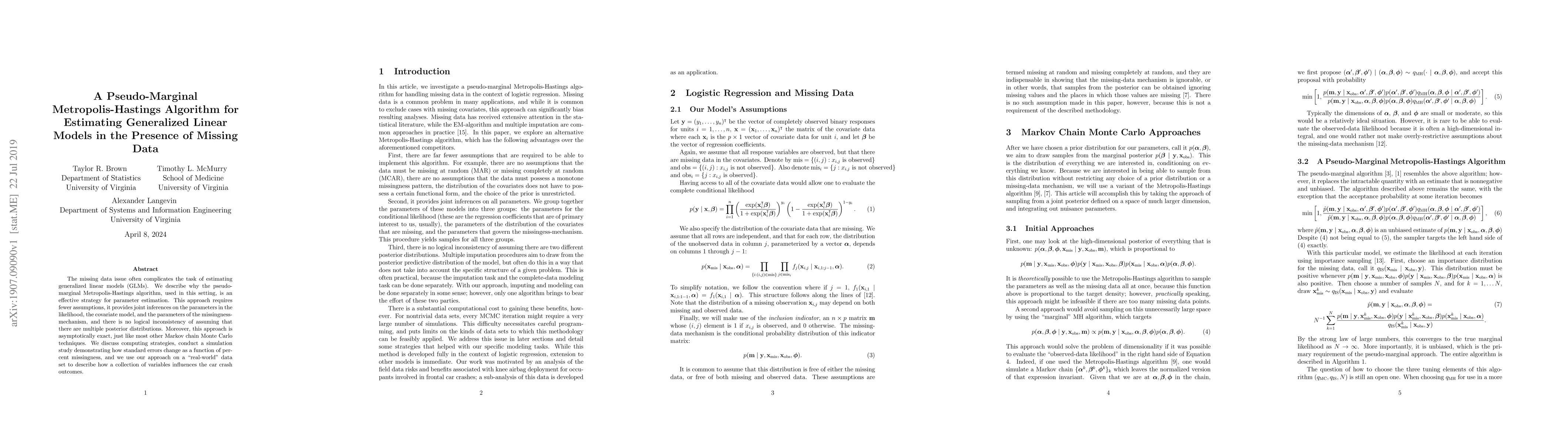 The missing data issue often complicates the task of estimating generalized linear models (GLMs). We describe why the pseudo-marginal Metropolis-Hastings algorithm, used in this setting, is an effective strategy for parameter estimation. This approach requires fewer assumptions, it provides joint inferences on the parameters in the likelihood, the covariate model, and the parameters of the missingness-mechanism, and there is no logical inconsistency of assuming that there are multiple posterior distributions. Moreover, this approach is asymptotically exact, just like most other Markov chain Monte Carlo techniques. We discuss computing strategies, conduct a simulation study demonstrating how standard errors change as a function of percent missingness, and we use our approach on a "real-world" data set to describe how a collection of variables influences the car crash outcomes.