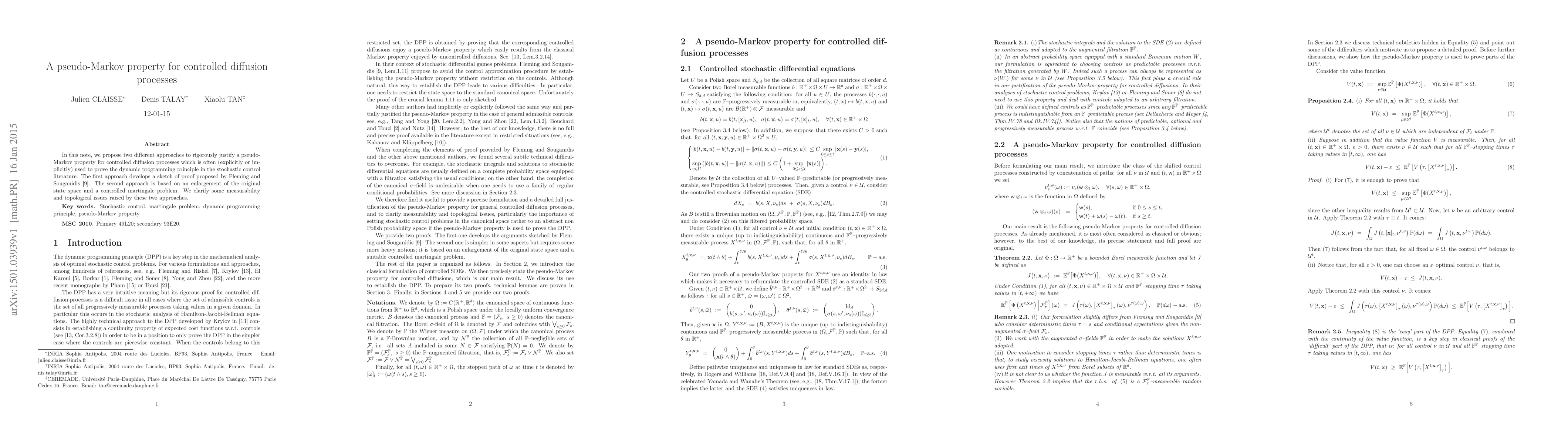 This paper proposes two methods to justify a pseudo-Markov property for controlled diffusion processes, essential for proving the dynamic programming principle. The first method follows Fleming and Souganidis' sketch, while the second involves enlarging the state space and a controlled martingale problem, addressing measurability and topological issues.