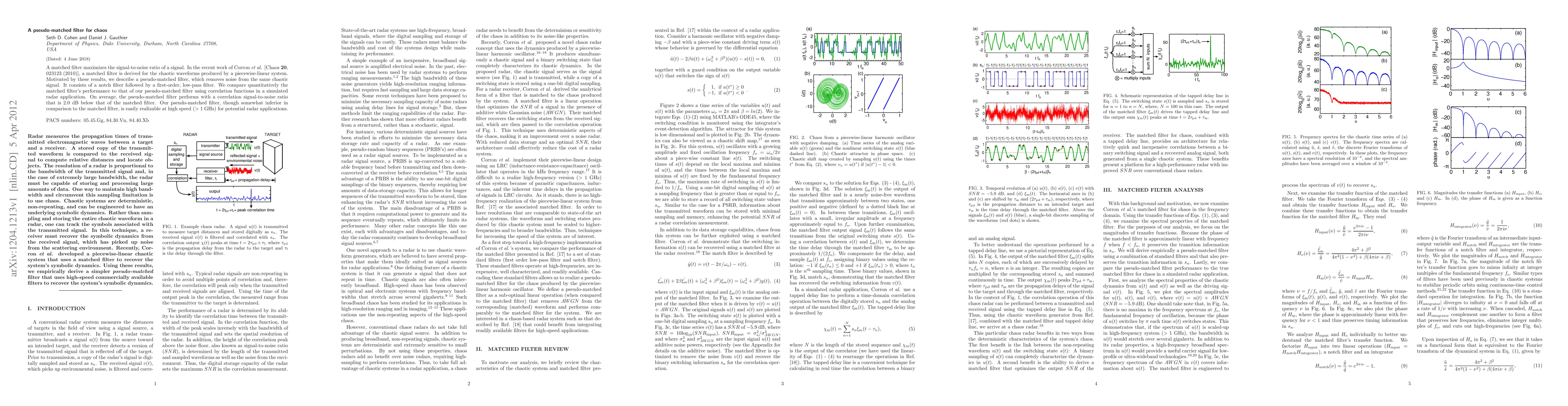A matched filter maximizes the signal-to-noise ratio of a signal. In the recent work of Corron et al. [Chaos 20, 023123 (2010)], a matched filter is derived for the chaotic waveforms produced by a piecewise-linear system. Motivated by these results, we describe a pseudo-matched filter, which removes noise from the same chaotic signal. It consists of a notch filter followed by a first-order, low-pass filter. We compare quantitatively the matched filter's performance to that of our pseudo-matched filter using correlation functions in a simulated radar application. On average, the pseudo-matched filter performs with a correlation signal-to-noise ratio that is 2.0 dB below that of the matched filter. Our pseudo-matched filter, though somewhat inferior in comparison to the matched filter, is easily realizable at high speed (> 1 GHz) for potential radar applications.