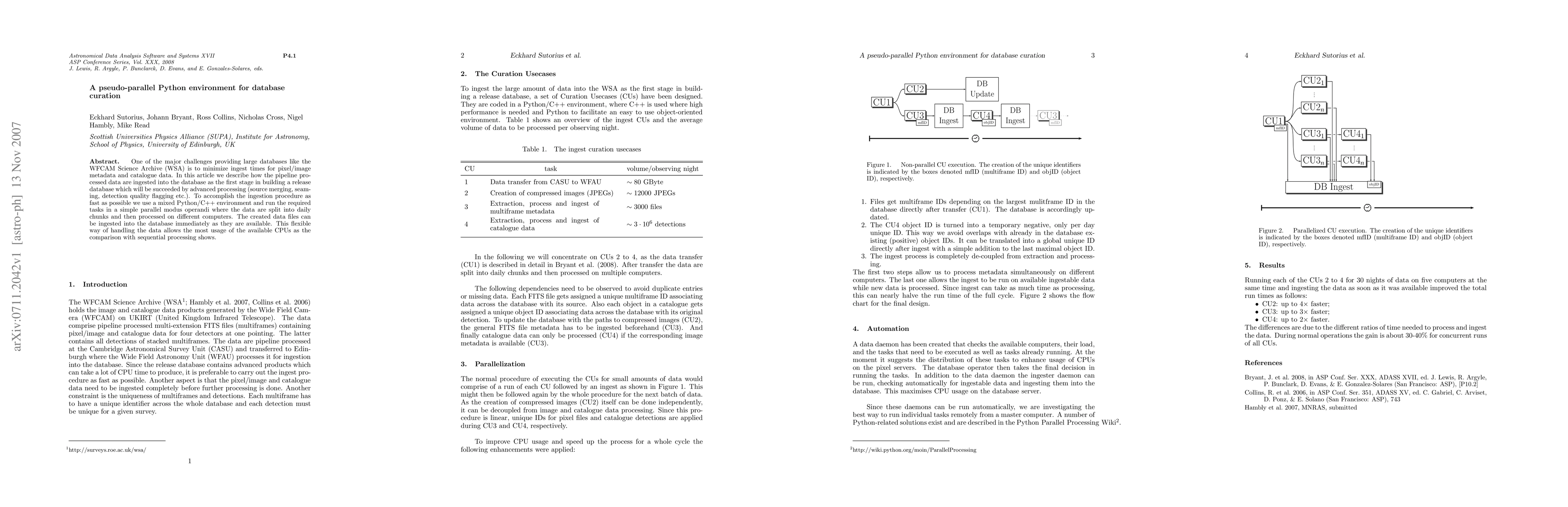 One of the major challenges providing large databases like the WFCAM Science Archive (WSA) is to minimize ingest times for pixel/image metadata and catalogue data. In this article we describe how the pipeline processed data are ingested into the database as the first stage in building a release database which will be succeeded by advanced processing (source merging, seaming, detection quality flagging etc.). To accomplish the ingestion procedure as fast as possible we use a mixed Python/C++ environment and run the required tasks in a simple parallel modus operandi where the data are split into daily chunks and then processed on different computers. The created data files can be ingested into the database immediately as they are available. This flexible way of handling the data allows the most usage of the available CPUs as the comparison with sequential processing shows.