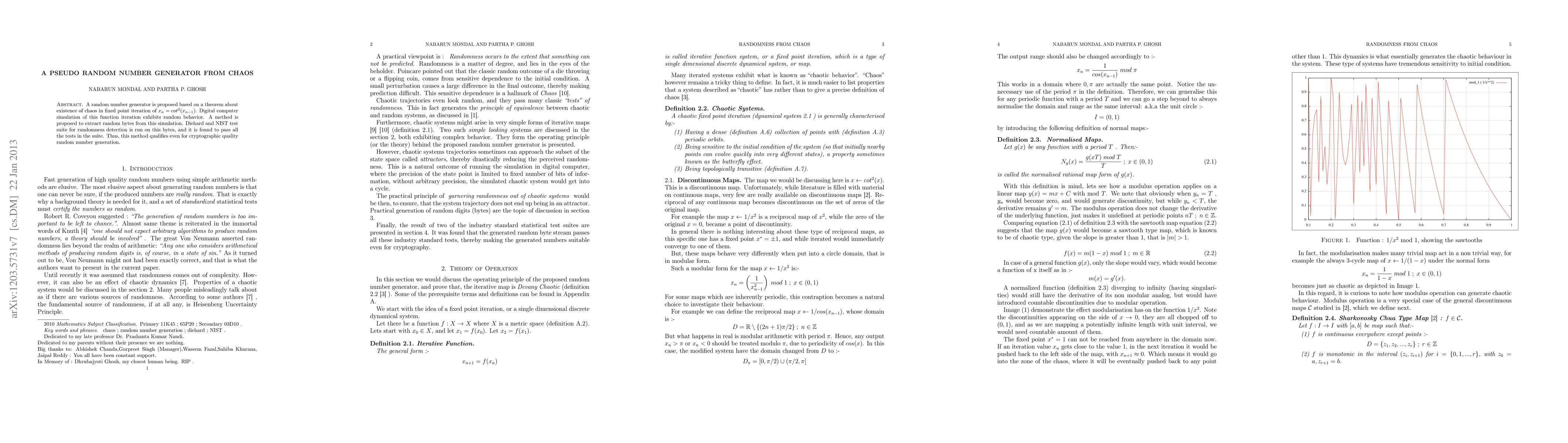 This paper proposes a pseudo-random number generator based on chaotic behavior from the fixed point iteration of x=cot²(x). Simulation results pass all tests from the Diehard and NIST test suites, indicating suitability for cryptographic quality random number generation.