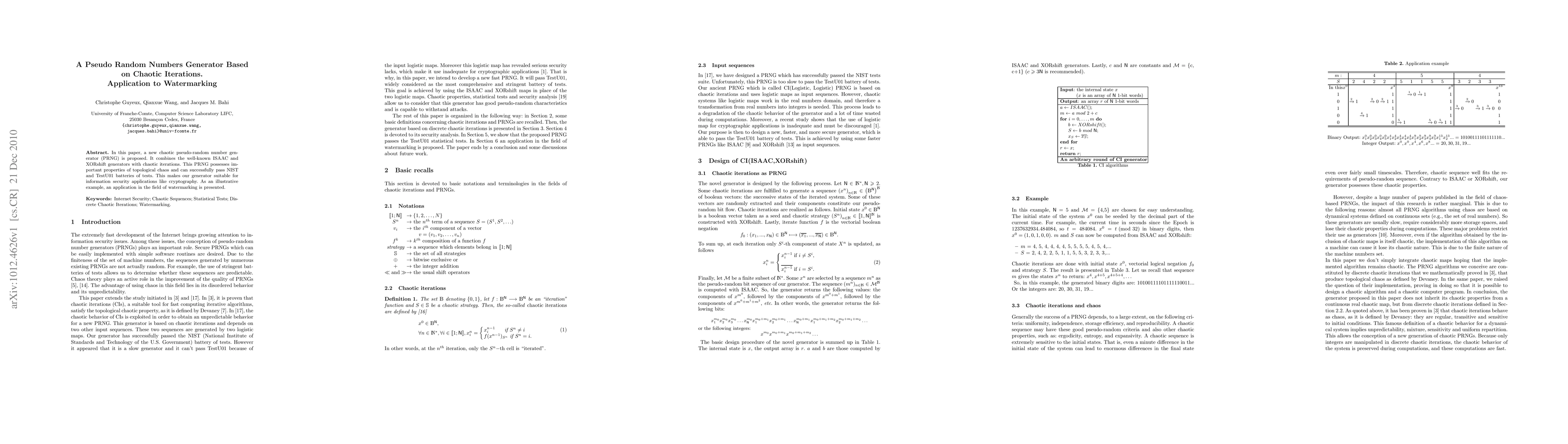 This paper introduces a novel chaotic pseudo-random number generator combining ISAAC and XORshift with chaotic iterations, passing NIST and TestU01 tests, and demonstrating its application in watermarking for information security.