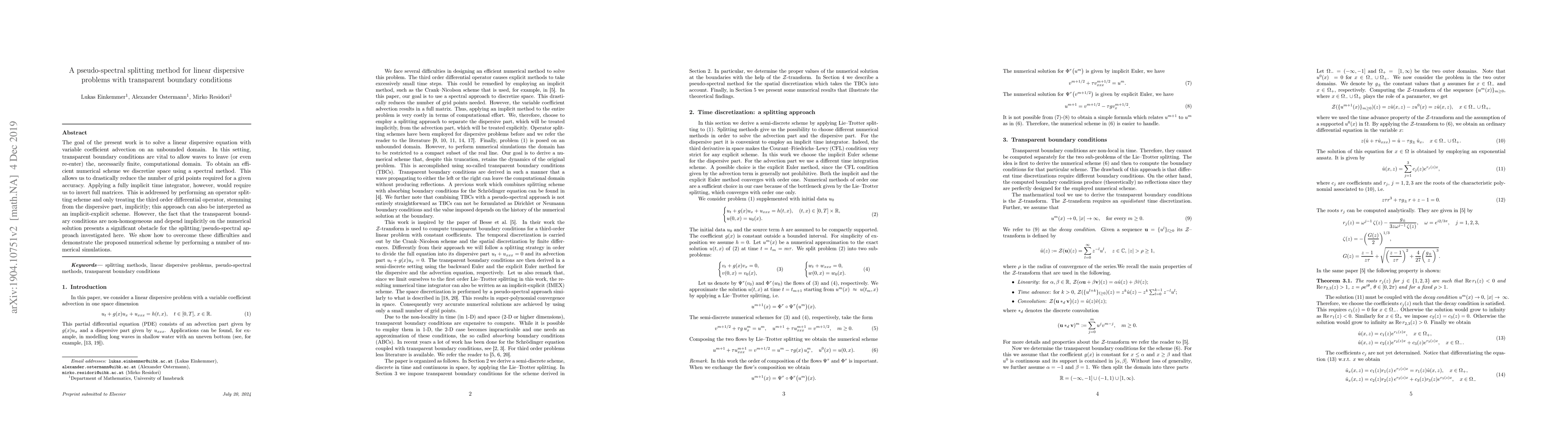 The goal of the present work is to solve a linear dispersive equation with variable coefficient advection on an unbounded domain. In this setting, transparent boundary conditions are vital to allow waves to leave (or even re-enter) the, necessarily finite, computational domain. To obtain an efficient numerical scheme we discretize space using a spectral method. This allows us to drastically reduce the number of grid points required for a given accuracy. Applying a fully implicit time integrator, however, would require us to invert full matrices. This is addressed by performing an operator splitting scheme and only treating the third order differential operator, stemming from the dispersive part, implicitly; this approach can also be interpreted as an implicit-explicit scheme. However, the fact that the transparent boundary conditions are non-homogeneous and depend implicitly on the numerical solution presents a significant obstacle for the splitting/pseudo-spectral approach investigated here. We show how to overcome these difficulties and demonstrate the proposed numerical scheme by performing a number of numerical simulations.
