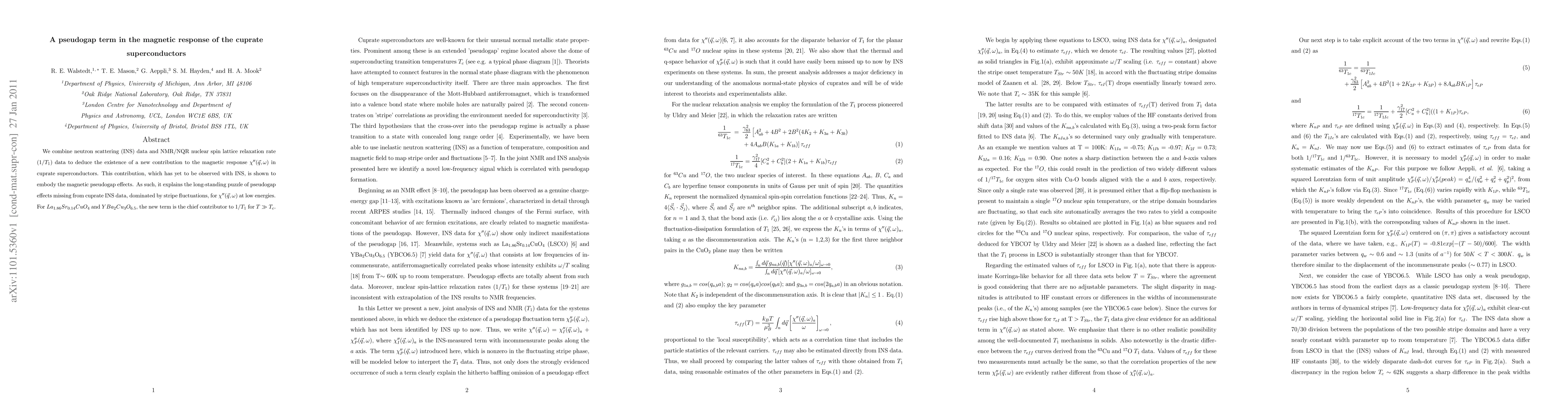 We combine neutron scattering (INS) and NMR/NQR nuclear spin lattice relaxation rate data to deduce the existence of a new contribution to the magnetic response (dynamic susceptibility) in cuprate superconductors. This contribution, which has yet to be observed with INS, is shown to embody the magnetic pseudogap effects. As such, it explains the long-standing puzzle of pseudogap effects missing from cuprate INS data, dominated by stripe fluctuations, for the dynamic susceptibility at low energies. For La_(1.86)Sr_(0.14)CuO_(4) and YBa_(2)Ba_(3)O_(6.5), the new term is the chief contributor to nuclear spin lattice relaxation at T >> T_(c).