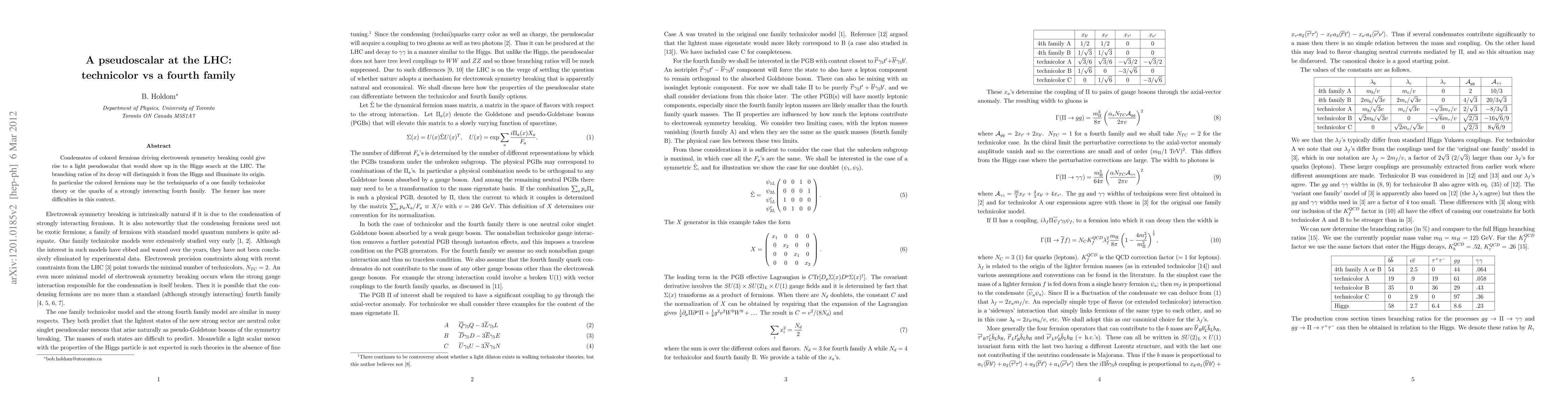 Condensates of colored fermions driving electroweak symmetry breaking could give rise to a light pseudoscalar that would show up in the Higgs search at the LHC. The branching ratios of its decay will distinguish it from the Higgs and illuminate its origin. In particular the colored fermions may be the techniquarks of a one family technicolor theory or the quarks of a strongly interacting fourth family. The former has more difficulties in this context.
