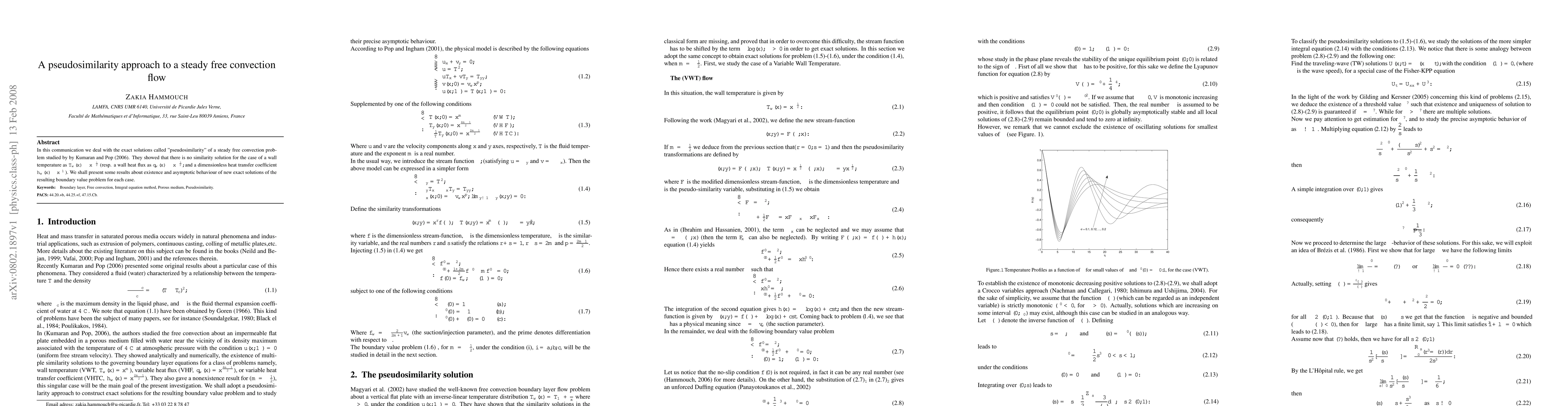 In this communication we deal with the exact solutions called "pseudosimilarity" of a steady free convection problem studied by by Kumaran and Pop (2006). They showed that there is no similarity solution for the case of a wall temperature as $T_{w}(x)\sim x^{-{1/2}}$ (resp. a wall heat flux as $q_{w}(x)\sim x^{-{3/2}},$ and a dimensionless heat transfer coefficient $h_{w}(x)\sim x^{-1}$). We shall present some results about existence and asymptotic behaviour of new exact solutions of the resulting boundary value problem for each case.