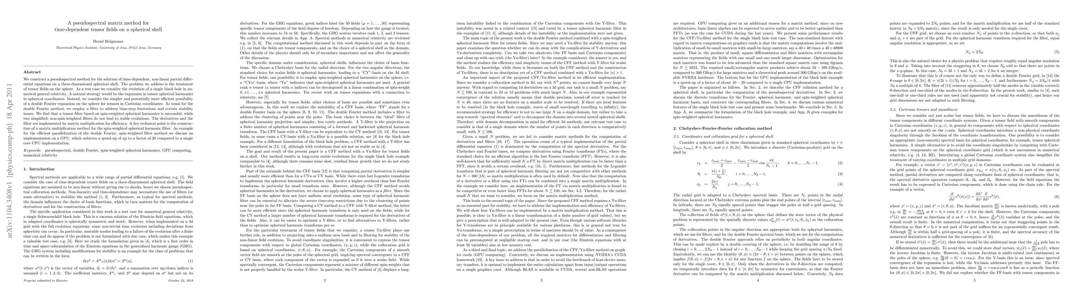 This paper develops a pseudospectral matrix method for solving time-dependent, non-linear partial differential equations on a spherical shell, focusing on tensor fields. It employs a double Fourier expansion in Cartesian coordinates and uses a spin-weighted spherical harmonic filter for stability, achieving significant speed-up on GPU implementations.