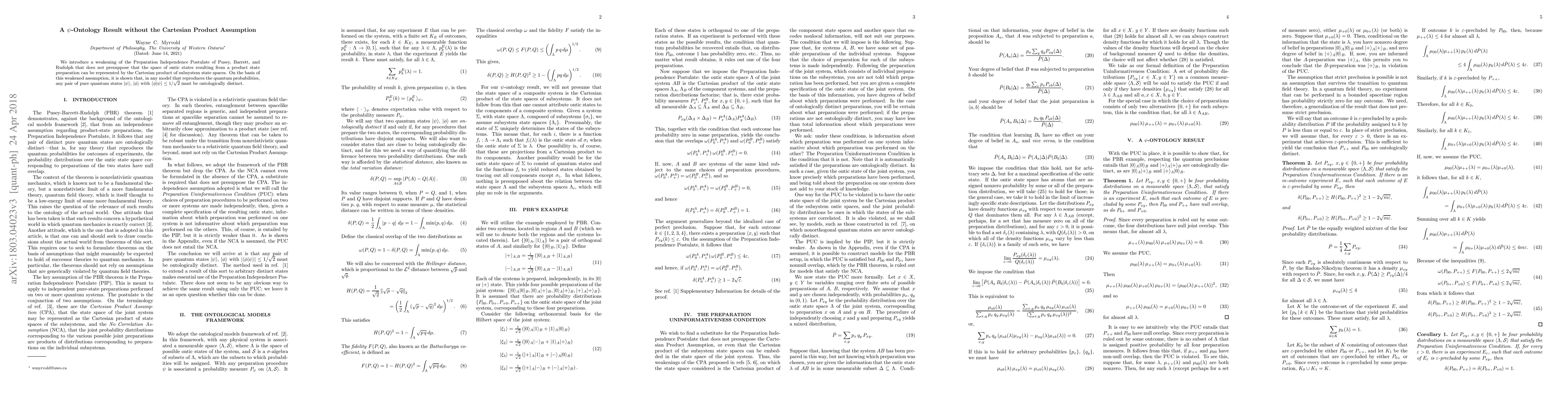 We introduce a weakening of the Preparation Independence Postulate of Pusey, Barrett, and Rudolph that does not presuppose that the space of ontic states resulting from a product state preparation can be represented by the Cartesian product of subsystem state spaces. On the basis of this weakened assumption, it is shown that, in any model that reproduces the quantum probabilities, any pair of pure quantum states $\ket{\psi}$, $\ket{\phi}$ with $\bkt{\phi}{\psi} \leq 1/\sqrt{2}$ must be ontologically distinct.