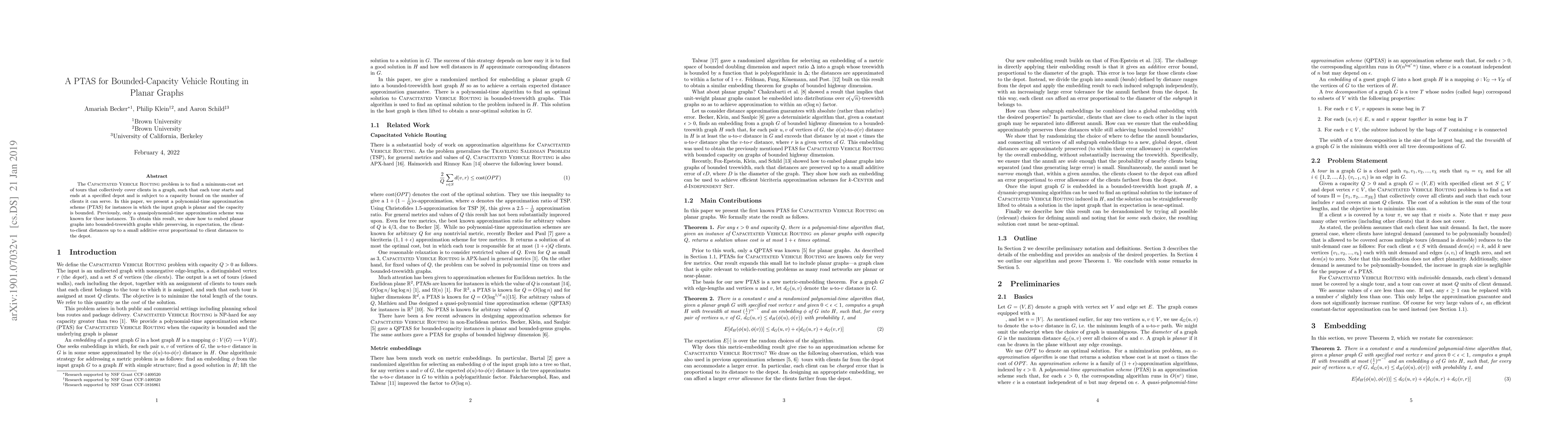 This paper introduces a polynomial-time approximation scheme (PTAS) for the Capacitated Vehicle Routing problem in planar graphs with bounded capacities, improving upon previous quasipolynomial-time methods. The authors achieve this by embedding planar graphs into bounded-treewidth graphs while maintaining expected client-to-client distances with a small additive error.