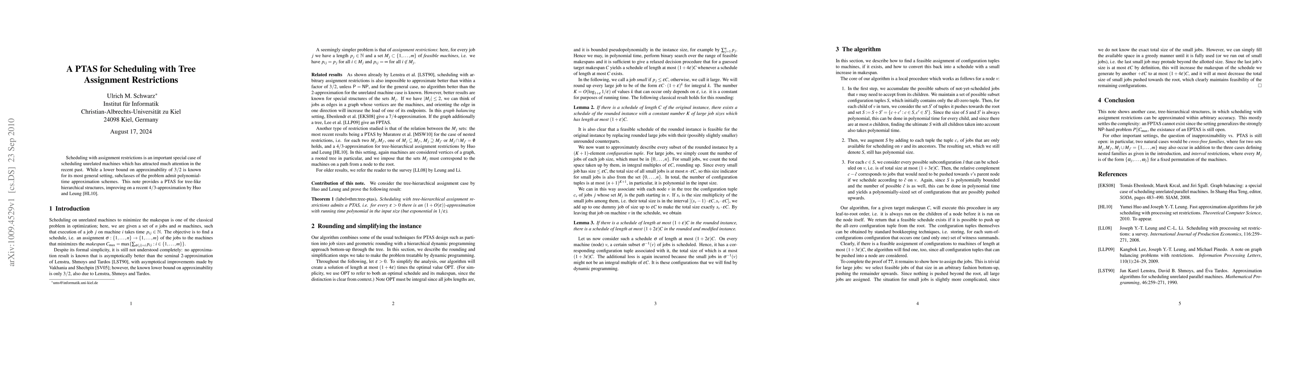 This paper presents a Polynomial Time Approximation Scheme (PTAS) for scheduling tasks with tree assignment restrictions, enhancing the previous 4/3-approximation algorithm by Huo and Leung. It addresses a significant subclass of scheduling unrelated machines with assignment restrictions.