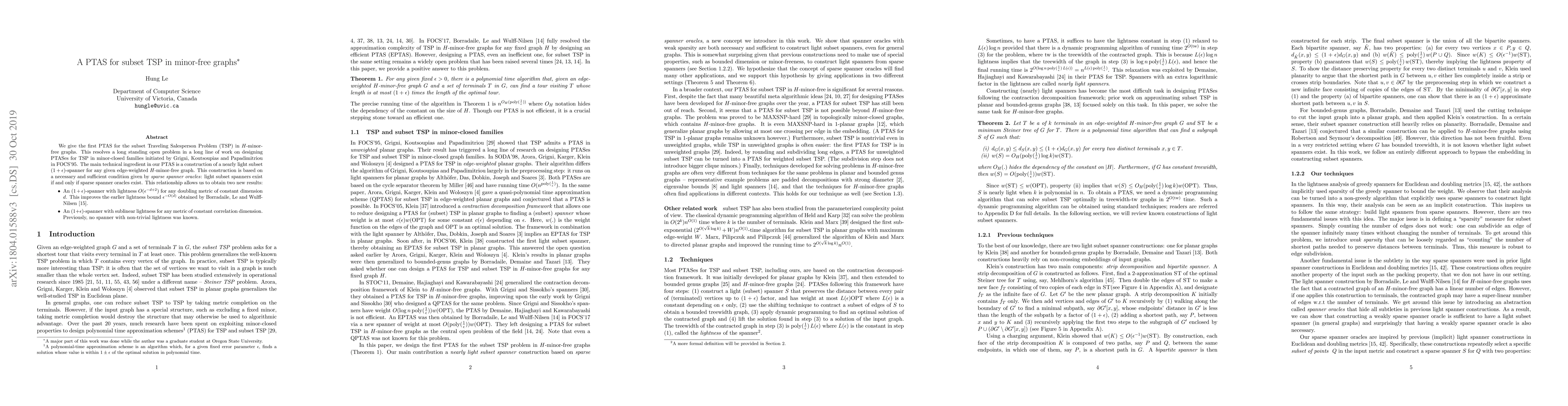 We give the first PTAS for the subset Traveling Salesperson Problem (TSP) in $H$-minor-free graphs. This resolves a long standing open problem in a long line of work on designing PTASes for TSP in minor-closed families initiated by Grigni, Koutsoupias and Papadimitriou in FOCS'95. The main technical ingredient in our PTAS is a construction of a nearly light subset $(1+\epsilon)$-spanner for any given edge-weighted $H$-minor-free graph. This construction is based on a necessary and sufficient condition given by \emph{sparse spanner oracles}: light subset spanners exist if and only if sparse spanner oracles exist. This relationship allows us to obtain two new results: _ An $(1+\epsilon)$-spanner with lightness $O(\epsilon^{-d+2})$ for any doubling metric of constant dimension $d$. This improves the earlier lightness bound $\epsilon^{-O(d)}$ obtained by Borradaile, Le and Wulff-Nilsen. _ An $(1+\epsilon)$-spanner with sublinear lightness for any metric of constant correlation dimension. Previously, no spanner with non-trivial lightness was known.
