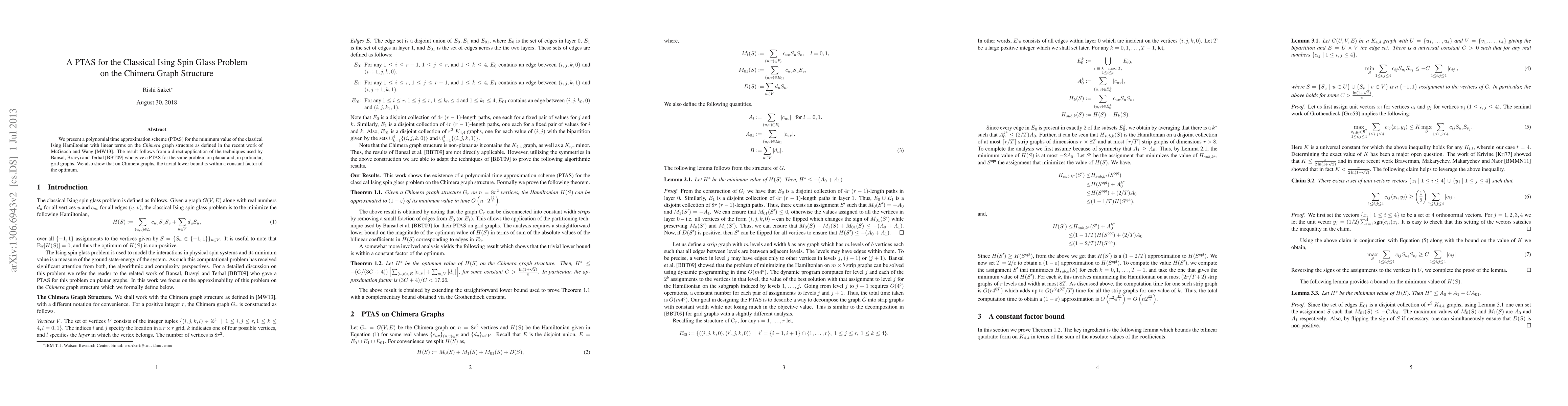 Summary: This paper introduces a PTAS for solving the classical Ising spin glass problem on Chimera graphs, adapting techniques from planar and grid graph solutions. It also establishes that the trivial lower bound is close to the optimal solution on these graphs.
