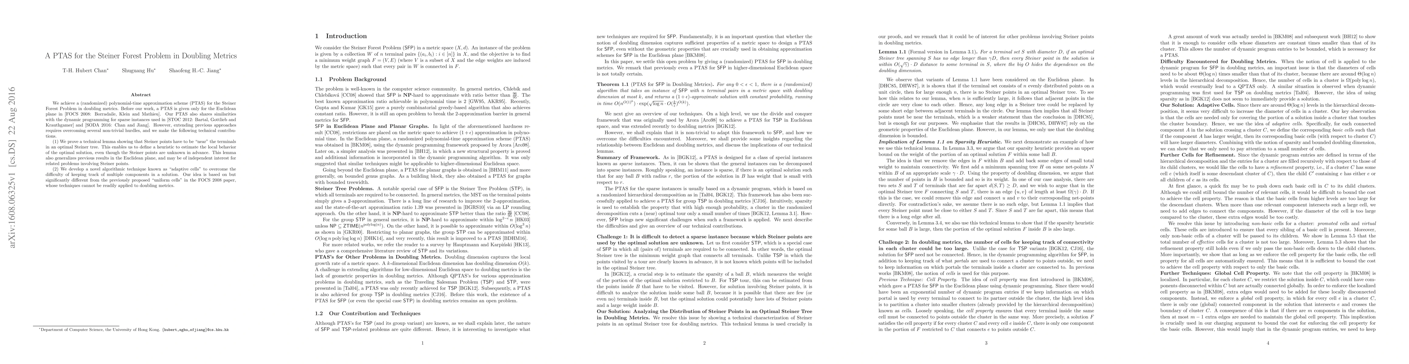 This paper presents a randomized polynomial-time approximation scheme (PTAS) for the Steiner Forest Problem in doubling metrics, overcoming technical hurdles unique to this setting. Key contributions include a lemma proving Steiner points are near terminals and a novel "adaptive cells" technique to manage multiple solution components.