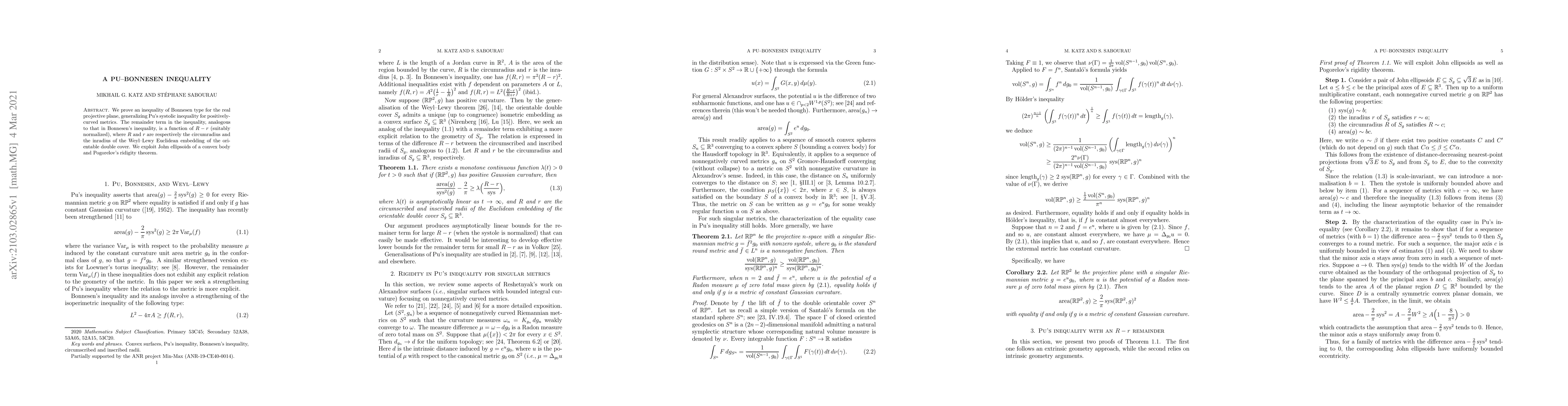 We prove an inequality of Bonnesen type for the real projective plane, generalizing Pu's systolic inequality for positively-curved metrics. The remainder term in the inequality, analogous to that in Bonnesen's inequality, is a function of R-r (suitably normalized), where R and r are respectively the circumradius and the inradius of the Weyl-Lewy Euclidean embedding of the orientable double cover. We exploit John ellipsoids of a convex body and Pogorelov's ridigity theorem.