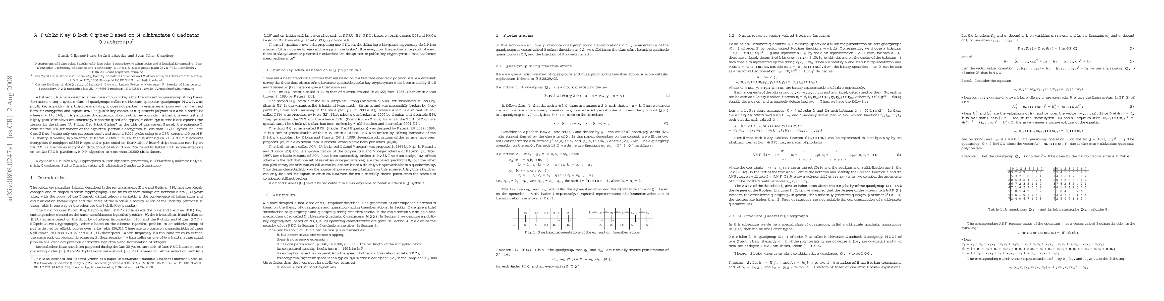 We have designed a new class of public key algorithms based on quasigroup string transformations using a specific class of quasigroups called multivariate quadratic quasigroups (MQQ). Our public key algorithm is a bijective mapping, it does not perform message expansions and can be used both for encryption and signatures. The public key consist of n quadratic polynomials with n variables where n=140, 160, ... . A particular characteristic of our public key algorithm is that it is very fast and highly parallelizable. More concretely, it has the speed of a typical modern symmetric block cipher - the reason for the phrase "A Public Key Block Cipher" in the title of this paper. Namely the reference C code for the 160-bit variant of the algorithm performs decryption in less than 11,000 cycles (on Intel Core 2 Duo -- using only one processor core), and around 6,000 cycles using two CPU cores and OpenMP 2.0 library. However, implemented in Xilinx Virtex-5 FPGA that is running on 249.4 MHz it achieves decryption throughput of 399 Mbps, and implemented on four Xilinx Virtex-5 chips that are running on 276.7 MHz it achieves encryption throughput of 44.27 Gbps. Compared to fastest RSA implementations on similar FPGA platforms, MQQ algorithm is more than 10,000 times faster.