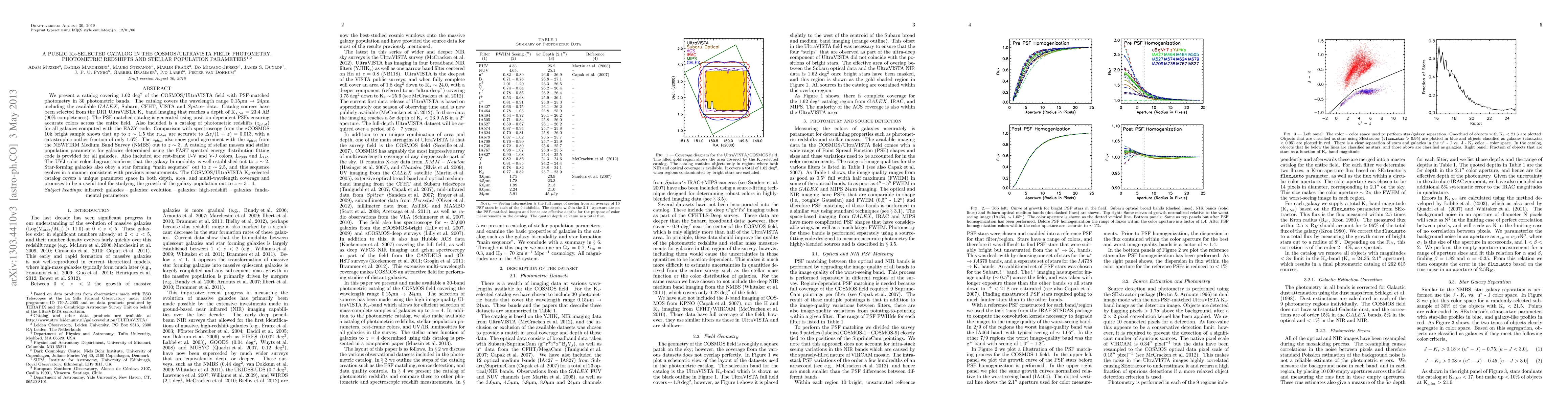This paper presents a comprehensive catalog of galaxies in the COSMOS/UltraVISTA field, featuring PSF-matched photometry across 30 bands from 0.15µm to 24µm. It includes photometric redshifts, stellar masses, and population parameters, demonstrating high accuracy and utility for studying galaxy evolution up to redshifts of 3-4.