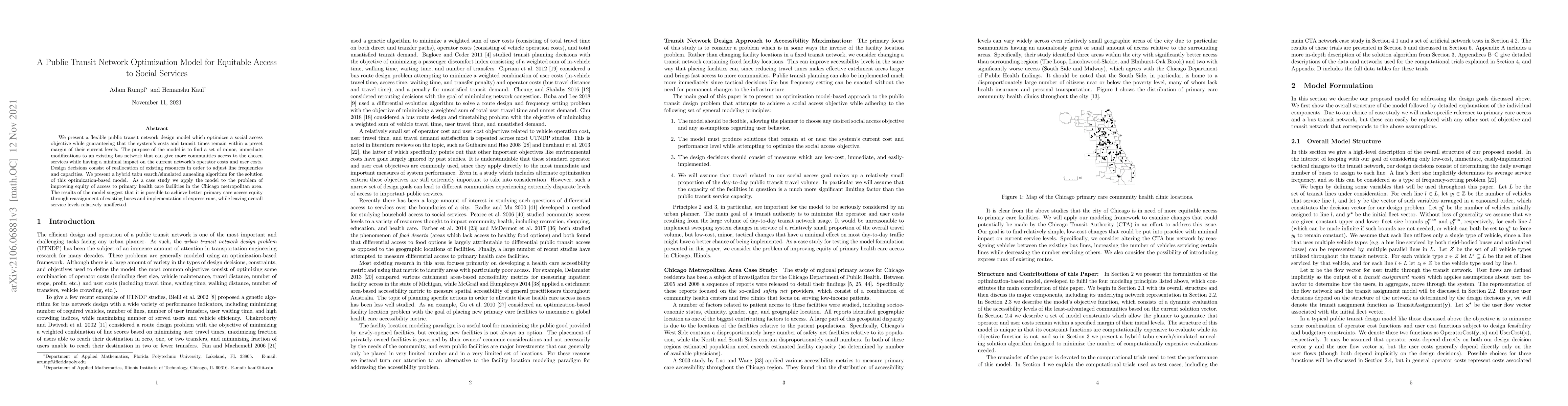 This paper proposes a public transit network optimization model to enhance equitable access to social services, specifically primary health care, in Chicago. The model uses a hybrid algorithm to find minor modifications to the existing bus network, optimizing social access while maintaining current costs and transit times.
