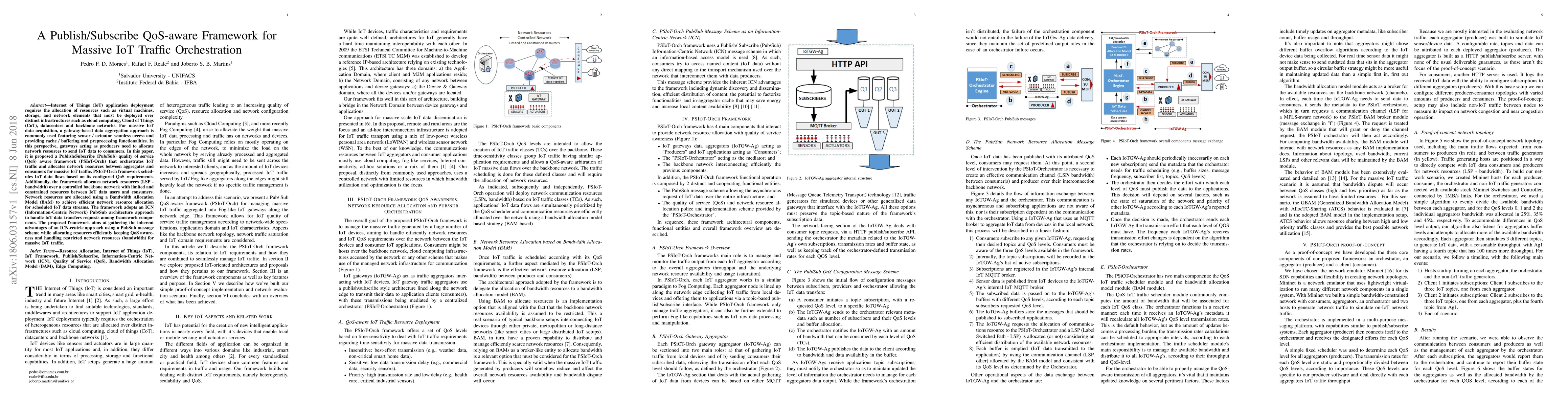 This paper proposes a QoS-aware Publish/Subscribe framework (PSIoT-Orch) for orchestrating massive IoT traffic, leveraging an ICN architecture to efficiently allocate network resources and manage QoS requirements for data flows between IoT gateways and consumers. The framework uses a Bandwidth Allocation Model to optimize resource usage in constrained backbone networks.