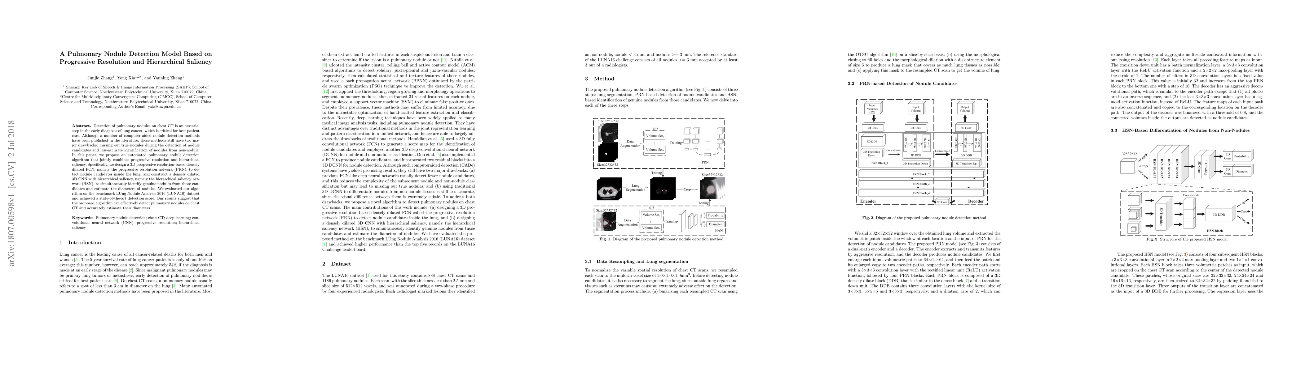 This paper proposes an advanced pulmonary nodule detection model combining progressive resolution and hierarchical saliency, utilizing a 3D PRN for candidate detection and an HSN for accurate identification and diameter estimation. The method achieved state-of-the-art results on the LUNA16 dataset, demonstrating effective nodule detection and diameter estimation.