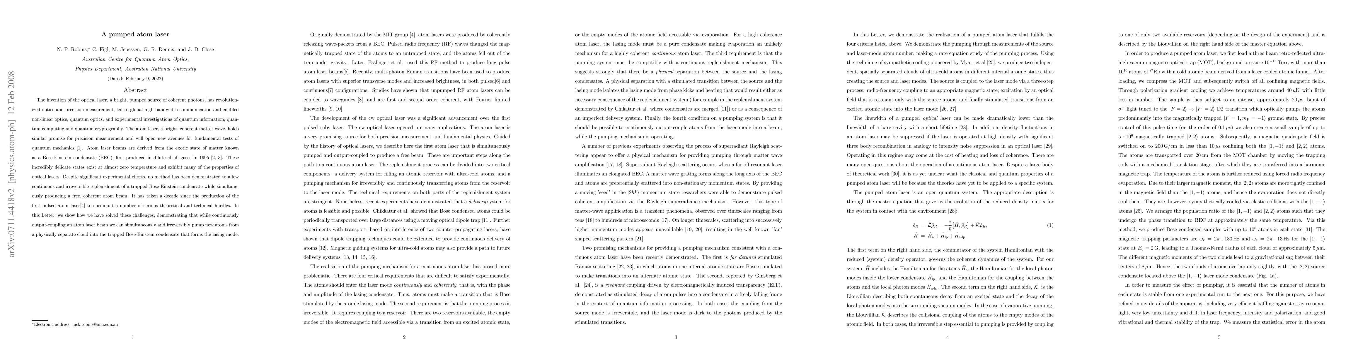 Summary: This paper reports the experimental realization of a pumped atom laser, detailing the process of pumping through measurements and a rate equation study to analyze the source and laser-mode atom numbers.
