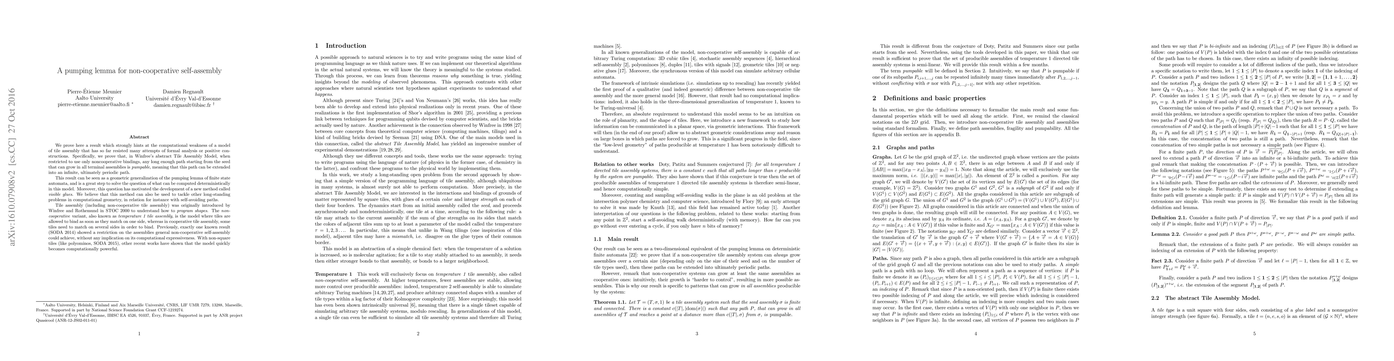 We prove a result which strongly hints at the computational weakness of a model of tile assembly that has so far resisted many attempts of formal analysis or positive constructions. Specifically, we prove that, in Winfree's abstract Tile Assembly Model, when restricted to use only noncooperative bindings, any long enough path starting from the seed that can grow in all terminal assemblies is pumpable, meaning that this path can be extended into an infinite, ultimately periodic path. This result can be seen as a geometric generalization of the pumping lemma of finite state automata, and closes the question of what can be computed deterministically in this model. Moreover, this question has motivated the development of a new method called visible glues. We believe that this method can also be used to tackle other long-standing problems in computational geometry, in relation for instance with self-avoiding paths. Tile assembly (including non-cooperative tile assembly) was originally introduced by Winfree and Rothemund in STOC 2000 to understand how to program shapes. The non-cooperative variant, also known as temperature 1 tile assembly, is the model where tiles are allowed to bind as soon as they match on one side, whereas in cooperative tile assembly, some tiles need to match on several sides in order to bind. Previously, exactly one known result (SODA 2014) showed a restriction on the assemblies general non-cooperative self-assembly could achieve, without any implication on its computational expressiveness. With non-square tiles (like polyominos, SODA 2015), other recent works have shown that the model quickly becomes computationally powerful.