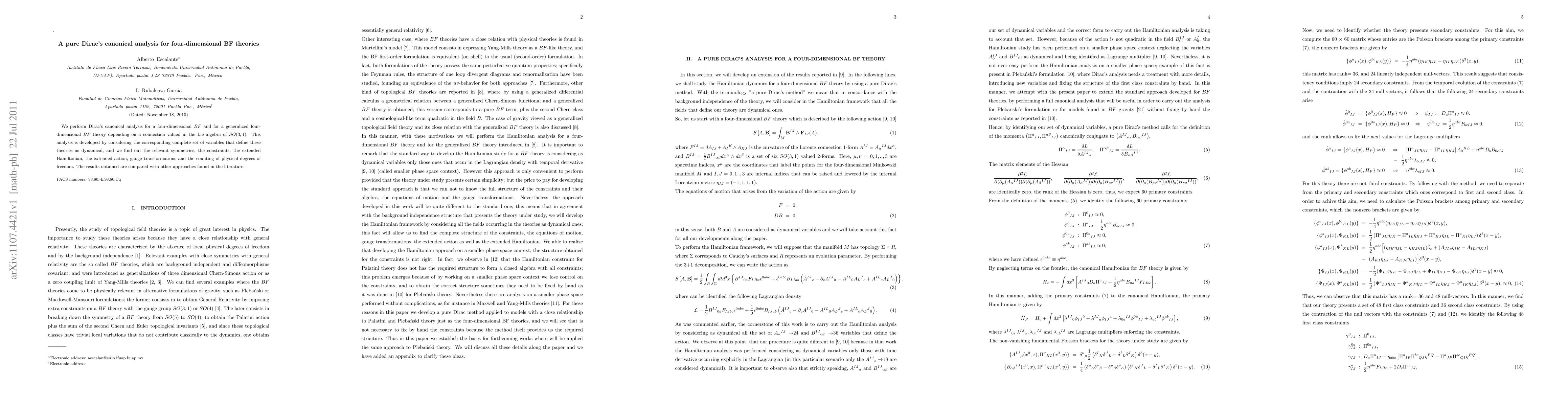 This paper conducts Dirac's canonical analysis on four-dimensional BF theories, identifying symmetries, constraints, and physical degrees of freedom, and compares its findings with existing literature. The analysis extends to generalized versions of these theories, revealing their gauge transformations and extended Hamiltonians.
