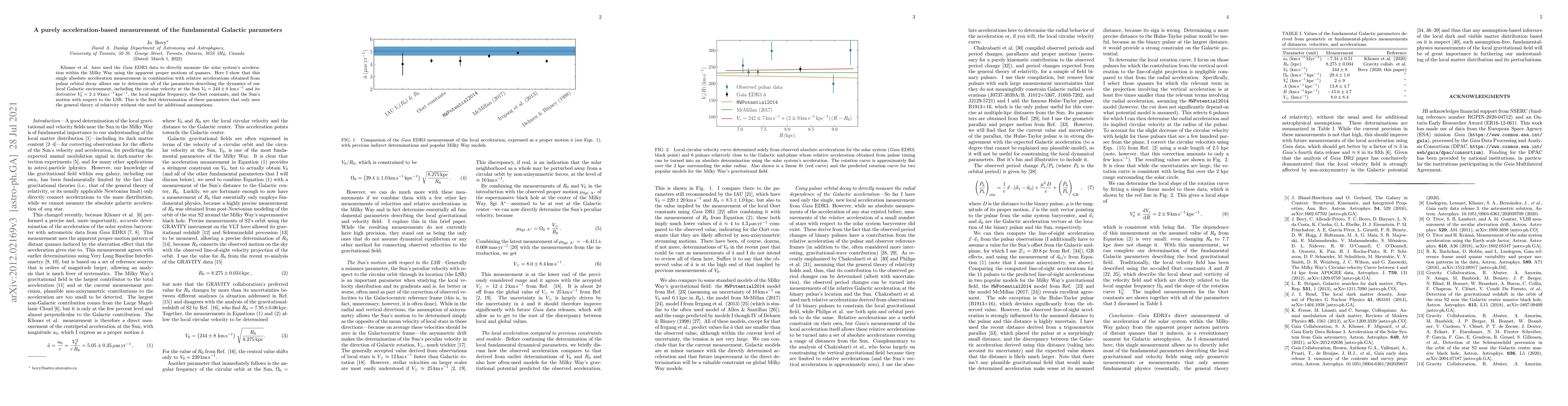 Klioner et al. have used the Gaia EDR3 data to directly measure the solar system's acceleration within the Milky Way using the apparent proper motions of quasars. Here I show that this single absolute acceleration measurement in combination with relative accelerations obtained from pulsar orbital decay allows one to determine all of the parameters describing the dynamics of our local Galactic environment, including the circular velocity at the Sun $V_0 = 244 \pm 8$ km/s and its derivative $V'_0 = 2 \pm 9$ km/s/kpc, the local angular frequency, the Oort constants, and the Sun's motion with respect to the LSR. This is the first determination of these parameters that only uses the general theory of relativity without the need for additional assumptions.