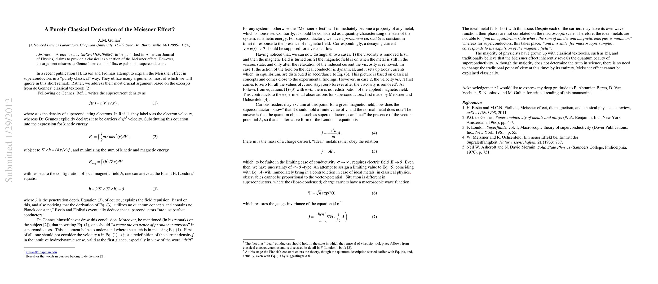 A recent study (arXiv:1109.1968v2, to be published in American Journal of Physics) claims to provide a classical explanation of the Meissner effect. However, the argument misuses de Gennes' derivation of flux expulsion in superconductors.