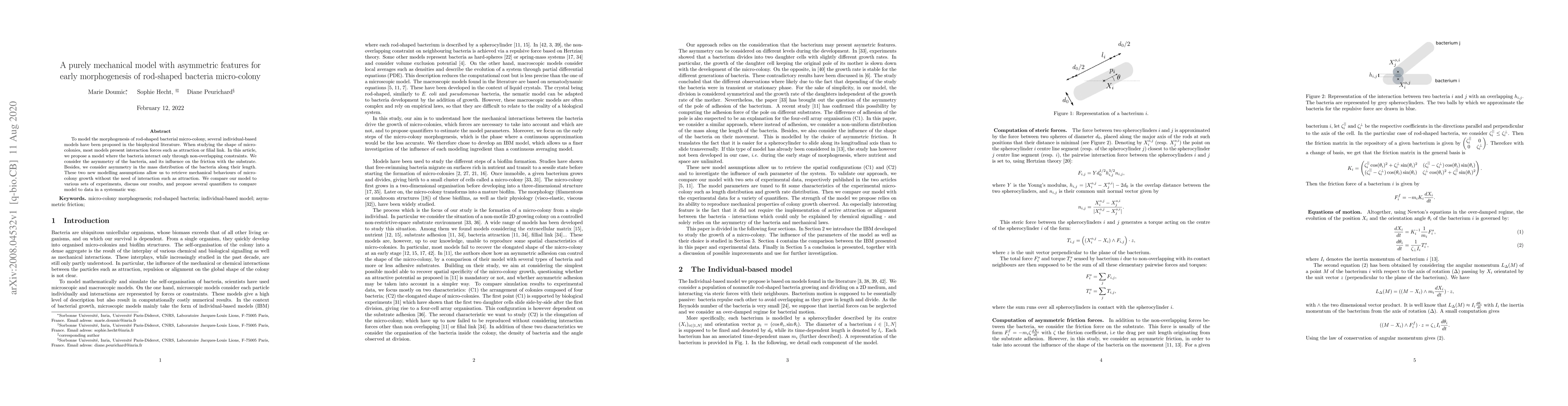 To model the morphogenesis of rod-shaped bacterial micro-colony, several individual-based models have been proposed in the biophysical literature. When studying the shape of micro-colonies, most models present interaction forces such as attraction or filial link. In this article, we propose a model where the bacteria interact only through non-overlapping constraints. We consider the asymmetry of the bacteria, and its influence on the friction with the substrate. Besides, we consider asymmetry in the mass distribution of the bacteria along their length. These two new modelling assumptions allow us to retrieve mechanical behaviours of micro-colony growth without the need of interaction such as attraction. We compare our model to various sets of experiments, discuss our results, and propose several quantifiers to compare model to data in a systematic way.