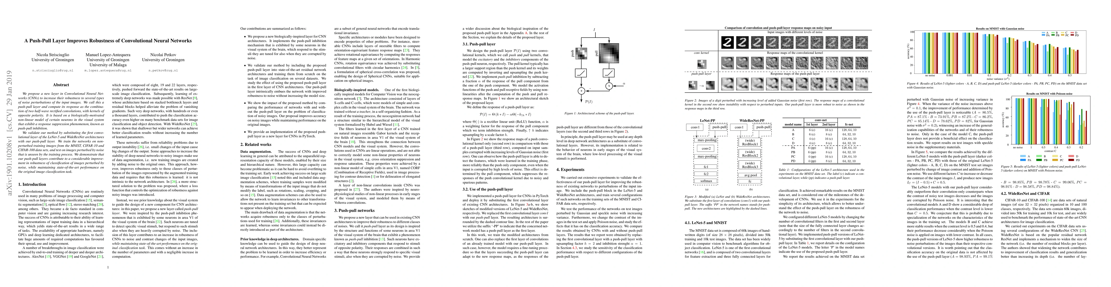 This paper introduces a push-pull layer in CNNs to enhance robustness against noise, combining two half-wave rectified convolutions with opposite kernels. The new layer improves classification accuracy on noisy images while maintaining top performance on clean images.