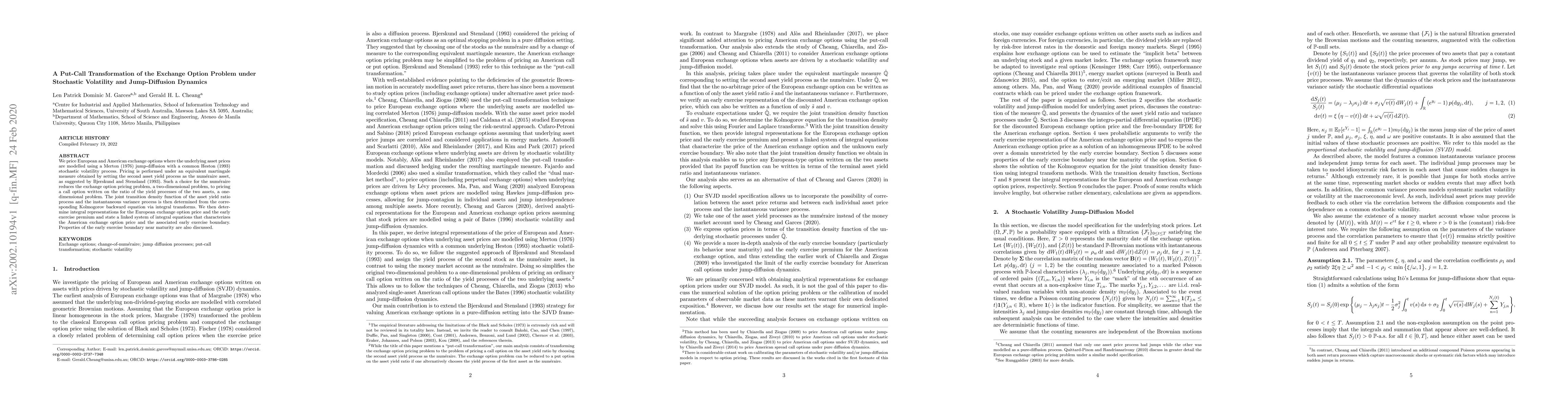 This paper prices European and American exchange options under a jump-diffusion model with stochastic volatility, transforming the problem into a one-dimensional call option on the ratio of yield processes. It derives integral representations for option prices and discusses the early exercise premium and boundary properties.
