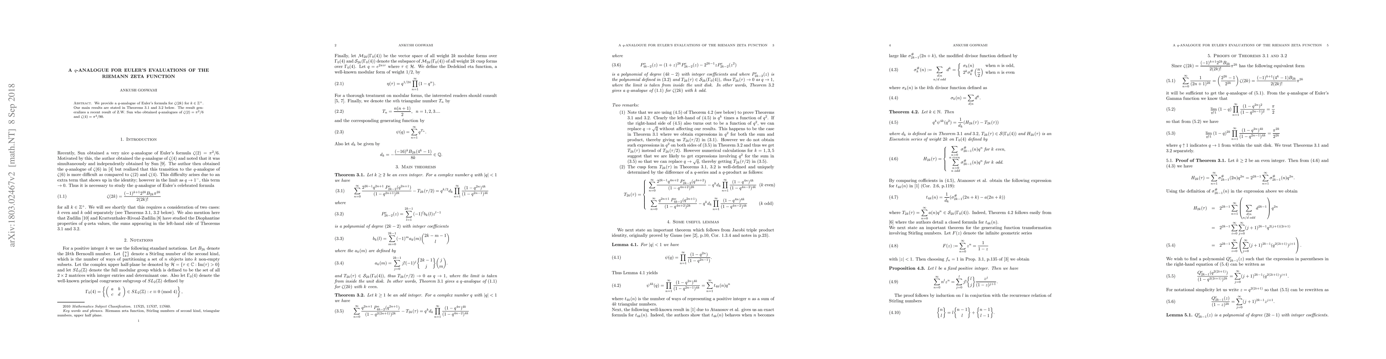 Title: A $q$-analogue for Euler's evaluations of the Riemann zeta function Summary: This paper generalizes Euler's formulas for even-index Riemann zeta values, providing $q$-analogues of $\zeta(2k)$ for $k\in\mathbb{Z}^+$, extending recent work by Z.W. Sun on $\zeta(2)$ and $\zeta(4)$.