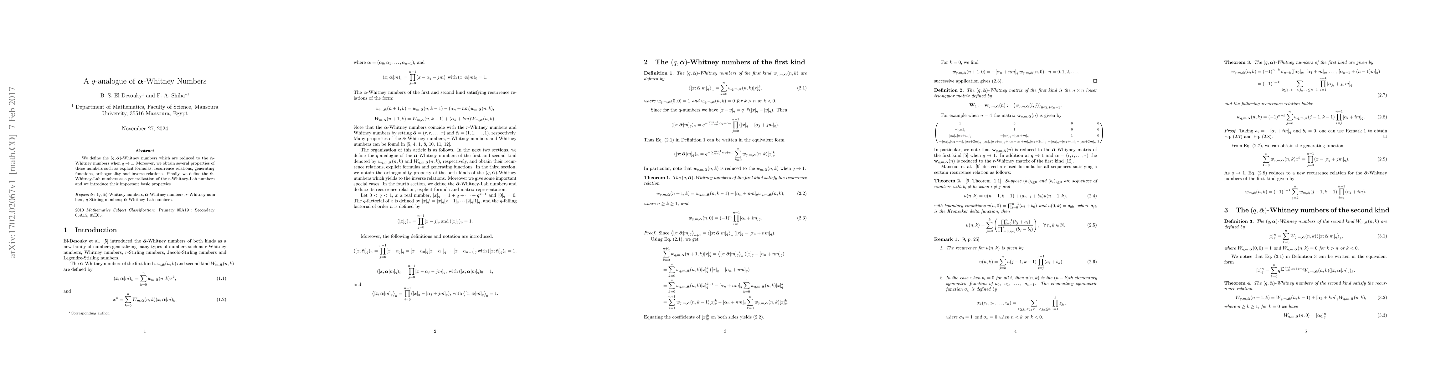 We define the $(q,\bar{\boldsymbol{\alpha}})$-Whitney numbers which are reduced to the $\bar{\boldsymbol{\alpha}}$-Whitney numbers when $q\rightarrow1$. Moreover, we obtain several properties of these numbers such as explicit formulas, recurrence relations, generating functions, orthogonality and inverse relations. Finally, we define the $\bar{\boldsymbol{\alpha}}$-Whitney-Lah numbers as a generalization of the $r$-Whitney-Lah numbers and we introduce their important basic properties.