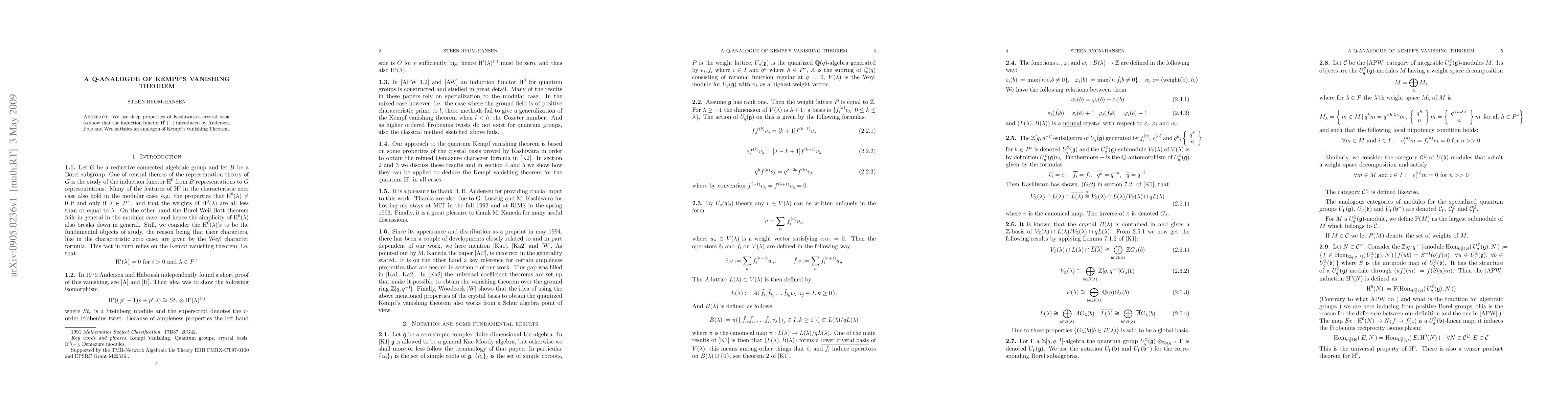 We use deep properties of Kashiwara's crystal basis to show that the induction functor $ {H}^0 (-) $ introduced by Andersen, Polo and Wen satisfies an analogon of Kempf's vanishing Theorem.