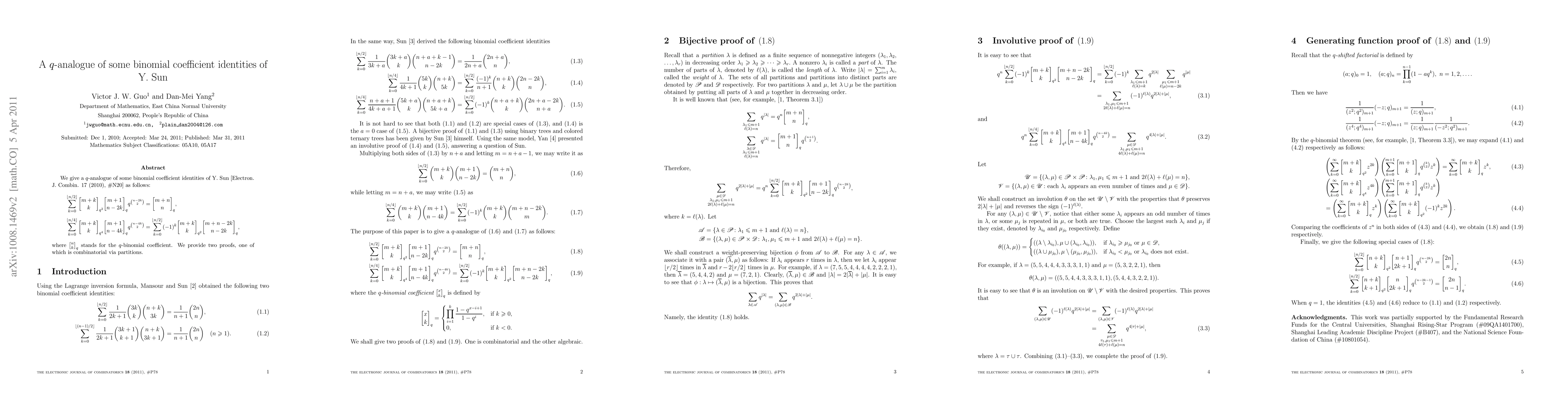 This paper presents $q$-analogues of binomial coefficient identities by Y. Sun, including two main equations involving $q$-binomial coefficients and $q$-power terms, and provides combinatorial proofs for these identities.