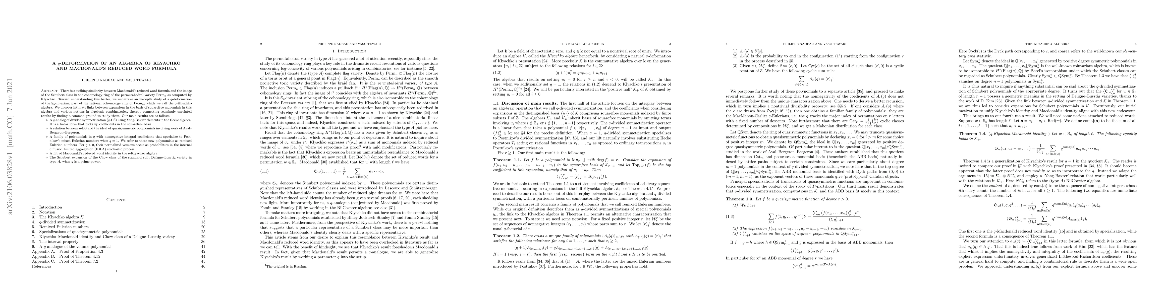 There is a striking similarity between Macdonald's reduced word formula and the image of the Schubert class in the cohomology ring of the permutahedral variety $\mathrm{Perm}_n$ as computed by Klyachko. Toward understanding this better, we undertake an in-depth study of a $q$-deformation of the $\mathbb{S}_n$-invariant part of the rational cohomology ring of $\mathrm{Perm}_n$, which we call the $q$-Klyachko algebra. We uncover intimate links between expansions in the basis of squarefree monomials in this algebra and various notions in algebraic combinatorics, thereby connecting seemingly unrelated results by finding a common ground to study them. Our main results are as follows. 1) A $q$-analog of divided symmetrization ($q$-DS) using Yang-Baxter elements in the Hecke algebra. It is a linear form that picks up coefficients in the squarefree basis. 2) A relation between $q$-DS and the ideal of quasisymmetric polynomials involving work of Aval--Bergeron--Bergeron. 3) A family of polynomials in $q$ with nonnegative integral coefficients that specialize to Postnikov's mixed Eulerian numbers when $q=1$. We refer to these new polynomials as remixed Eulerian numbers. For $q>0$, their normalized versions occur as probabilities in the internal diffusion limited aggregation (IDLA) stochastic process. 4) A lift of Macdonald's reduced word identity in the $q$-Klyachko algebra. 5) The Schubert expansion of the Chow class of the standard split Deligne--Lusztig variety in type $A$, when $q$ is a prime power.