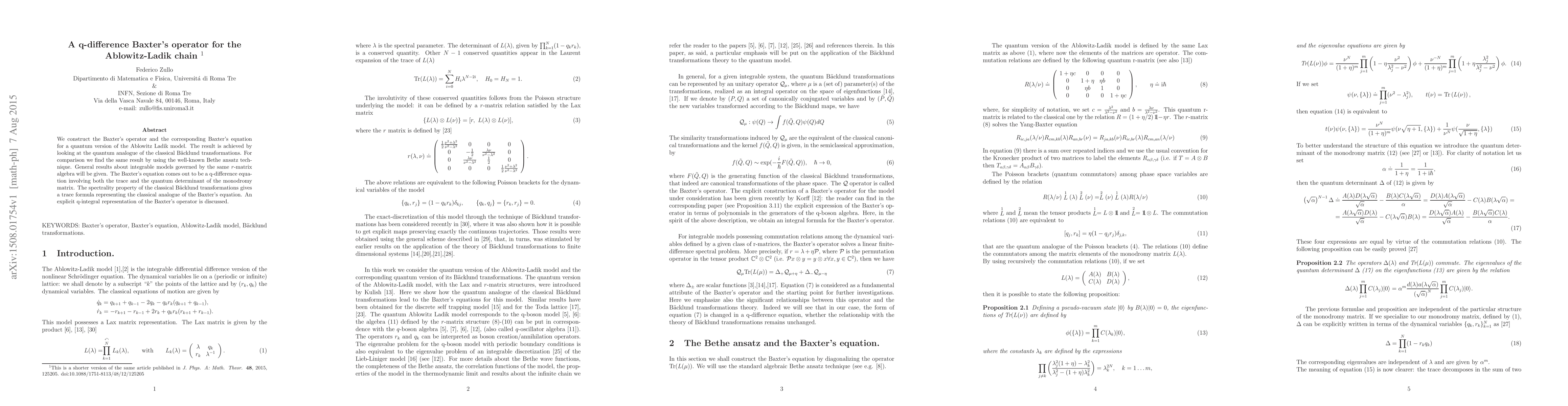 We construct the Baxter's operator and the corresponding Baxter's equation for a quantum version of the Ablowitz Ladik model. The result is achieved by looking at the quantum analogue of the classical Backlund transformations. For comparison we find the same result by using the well-known Bethe ansatz technique. General results about integrable models governed by the same r-matrix algebra will be given. The Baxter's equation comes out to be a q-difference equation involving both the trace and the quantum determinant of the monodromy matrix. The spectrality property of the classical Backlund transformations gives a trace formula representing the classical analogue of the Baxter's equation. An explicit q-integral representation of the Baxter's operator is discussed.