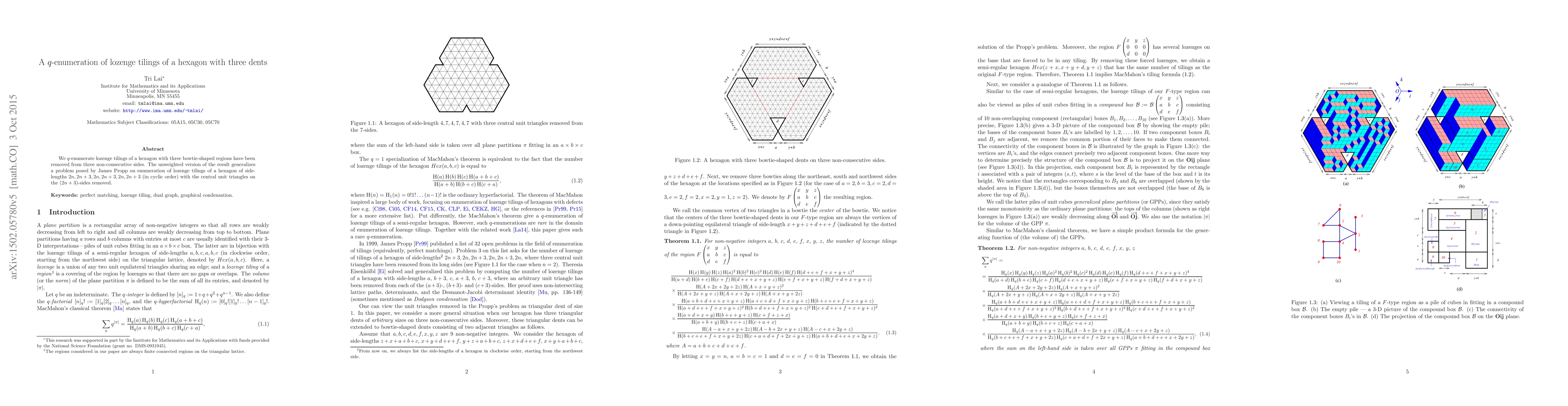 This paper provides a $q$-enumeration for lozenge tilings of a hexagon with three removed regions, extending a problem by James Propp concerning hexagons of specific side lengths with central triangles excised. The findings generalize previous enumeration results.